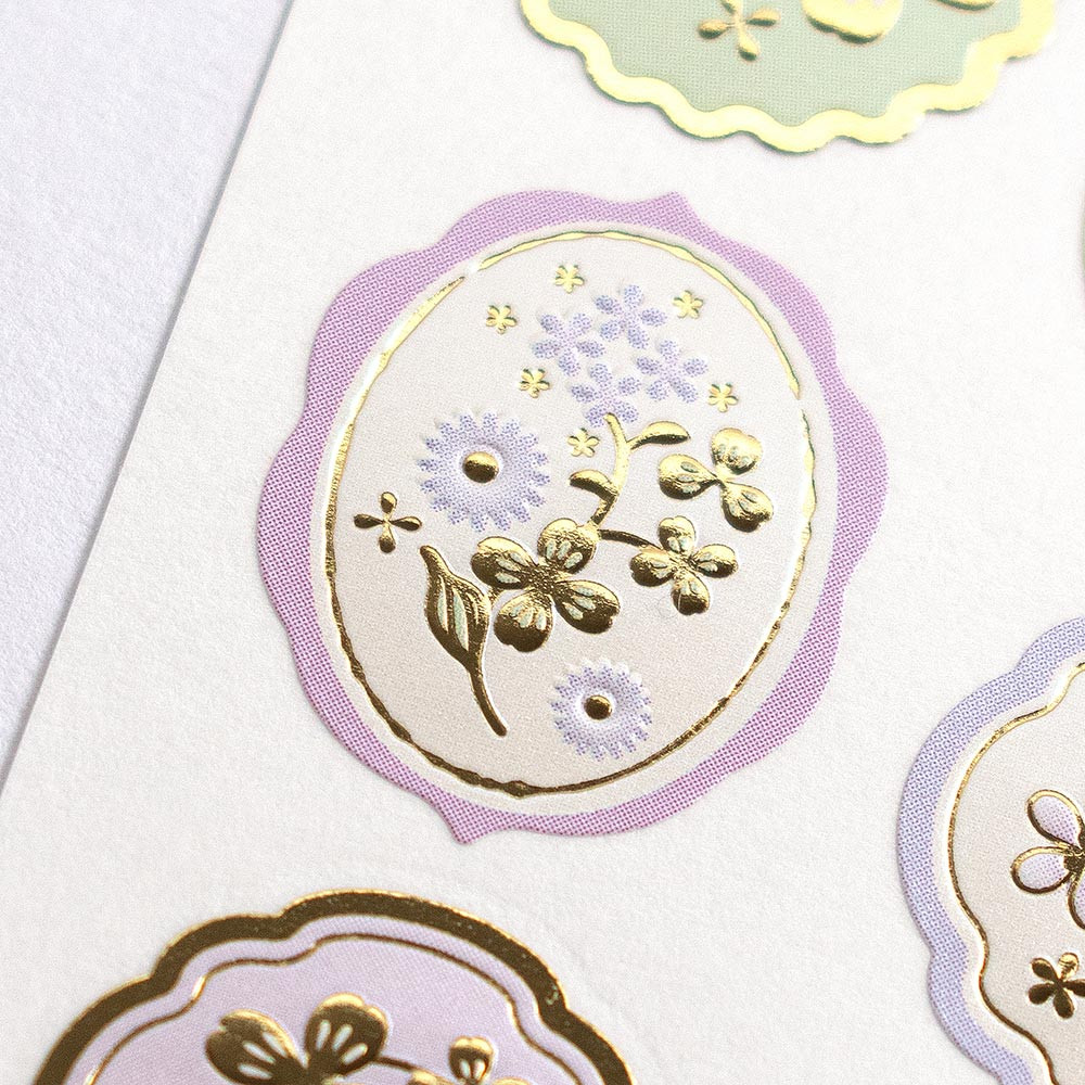 やさしく輝くパール紙に丸みのあるエンボス加工と金箔押し加工を施したシールです。 小花やクローバーを描いた上品なデザインです。