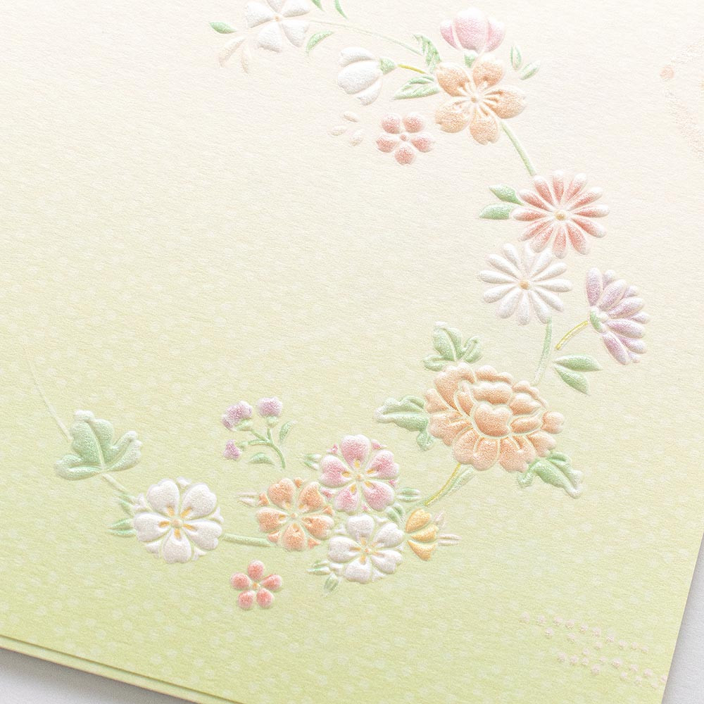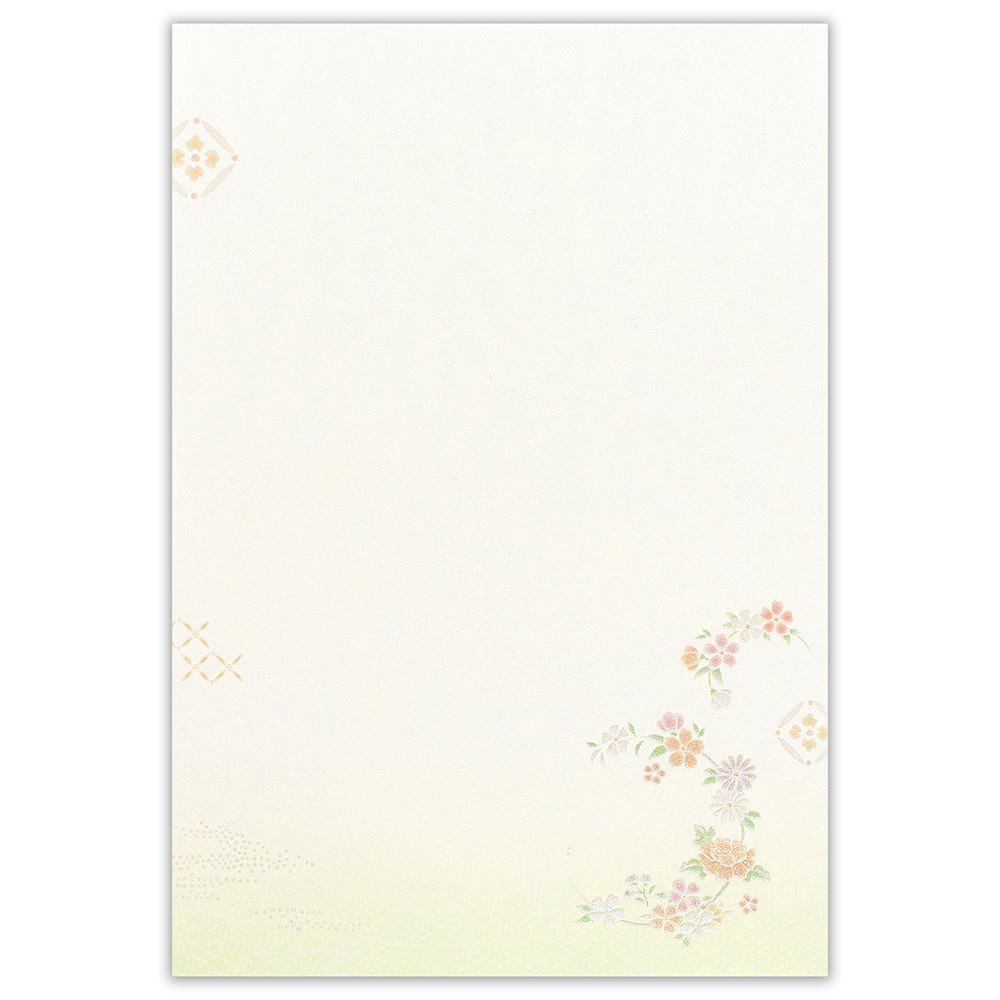 桜や菊、牡丹などの縁起の良いお花があしらわれています。普段使いのお便りから少しかしこまった場面のお便りまで、季節を問わず幅広くお使いいただけます。