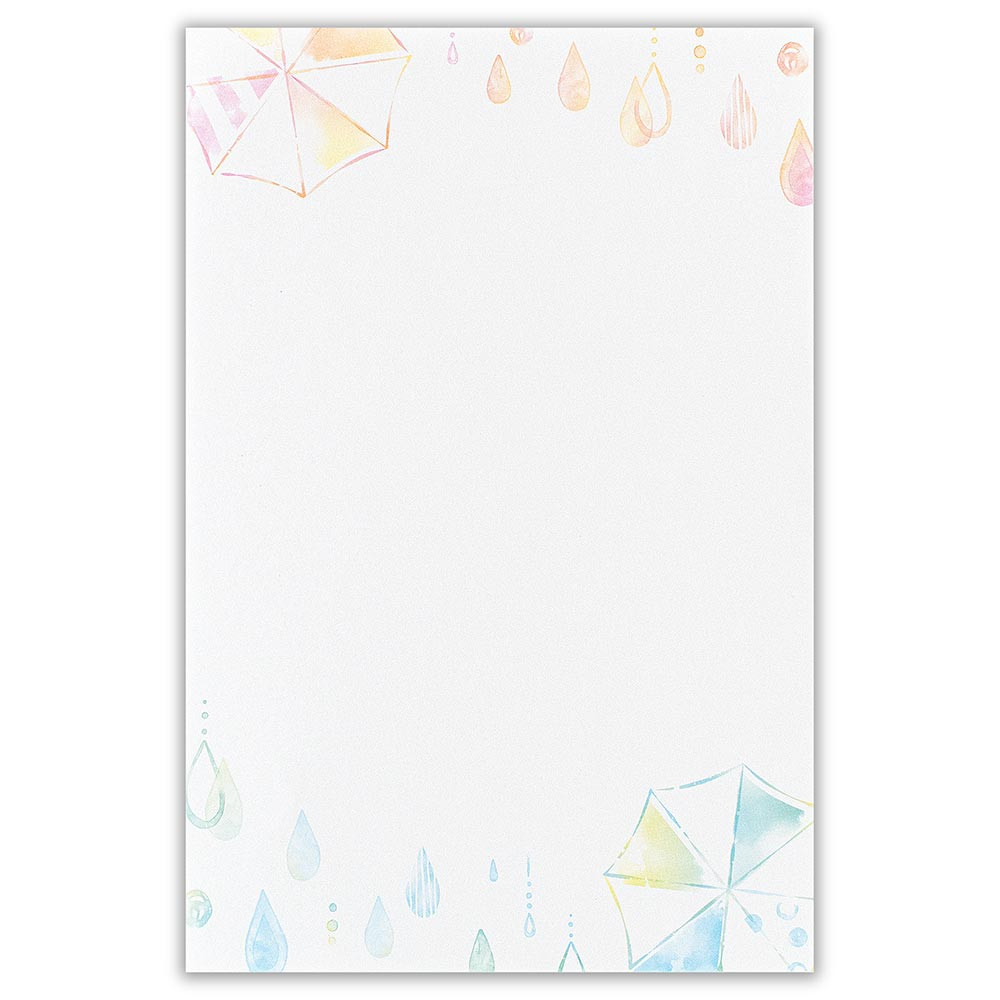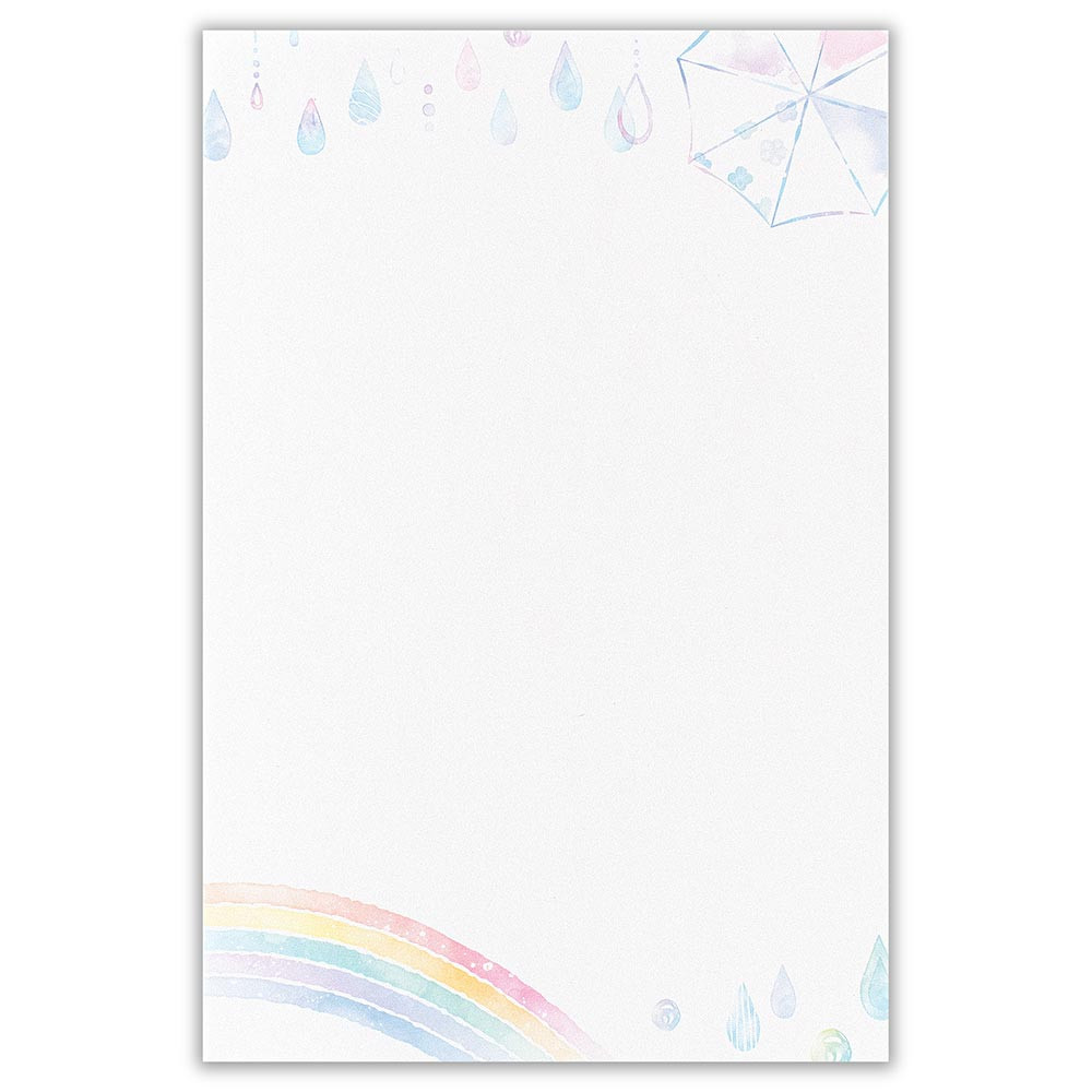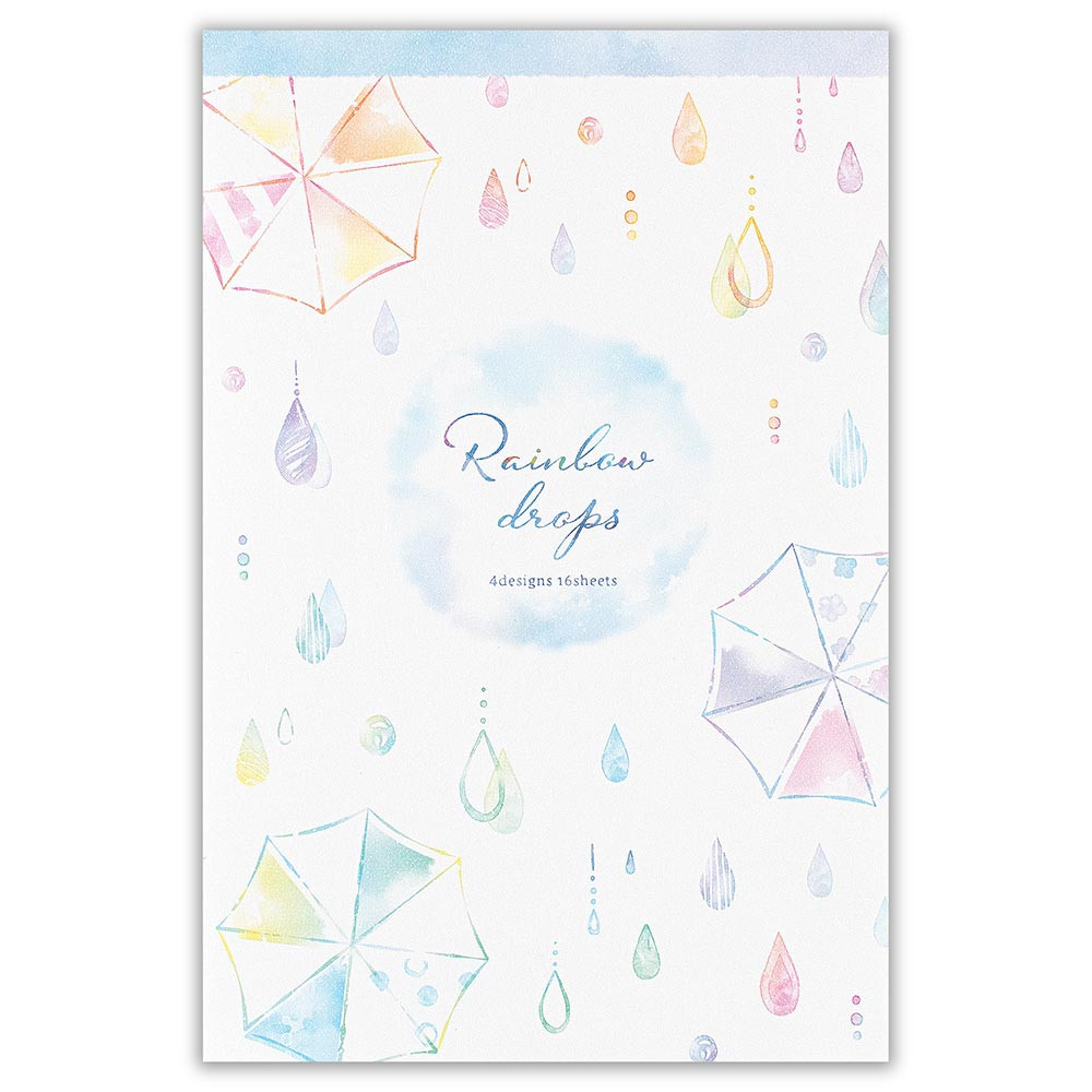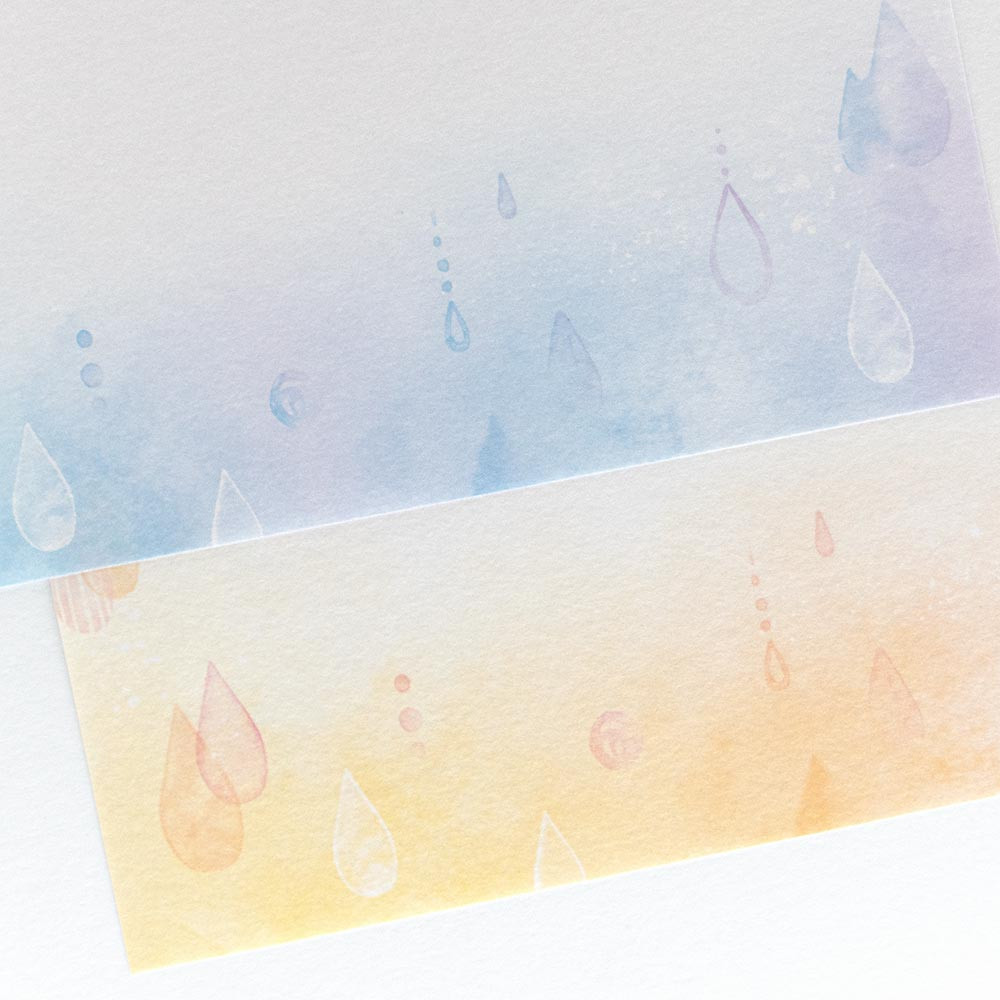 雫や傘、雨上がりの虹を水彩風の爽やかなタッチでカラフルに描きました。 風合いのある和紙を使用しており、4種類の柄を楽しめます。