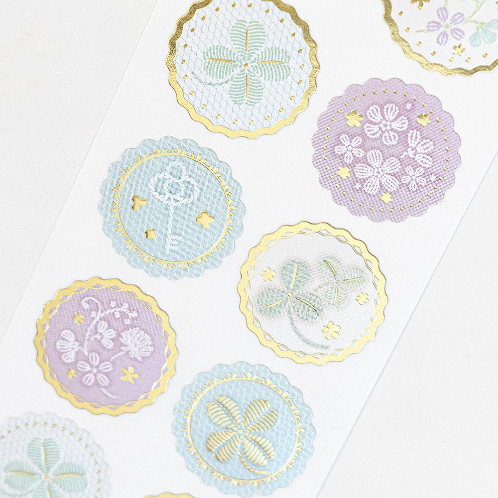 ラッキーモチーフのクローバーと鍵や小花の刺繍柄を優しい印象にデザインした封緘シールです。