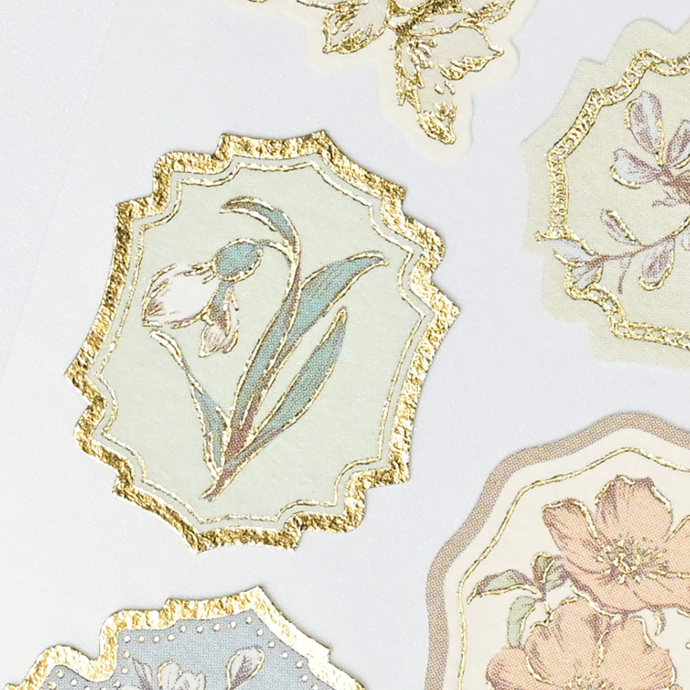 一重咲きのバラやフランネルフラワー、スノードロップの花にきらりと輝く金箔押し加工が施されており、手帳デコやワンポイントデコレーションにおすすめです。