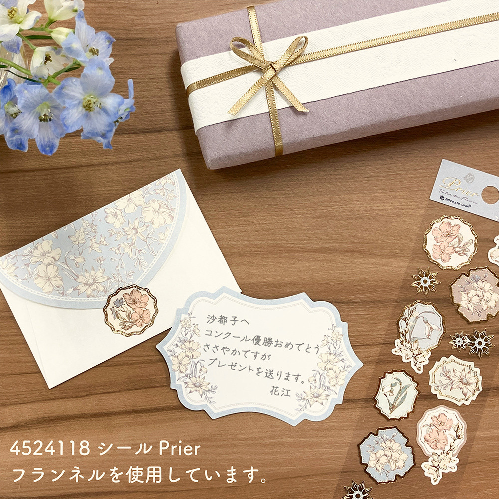 フランネルフラワーや一重咲きのバラ、デルフィニウム、スノードロップを繊細なタッチで描いたクラシカルで上品な印象の封筒付きメッセージカードです。