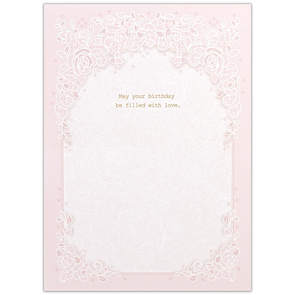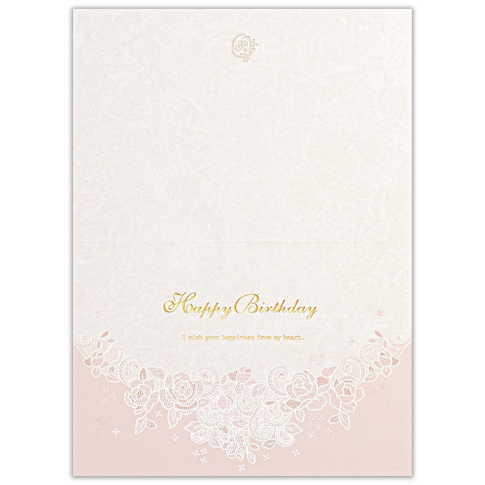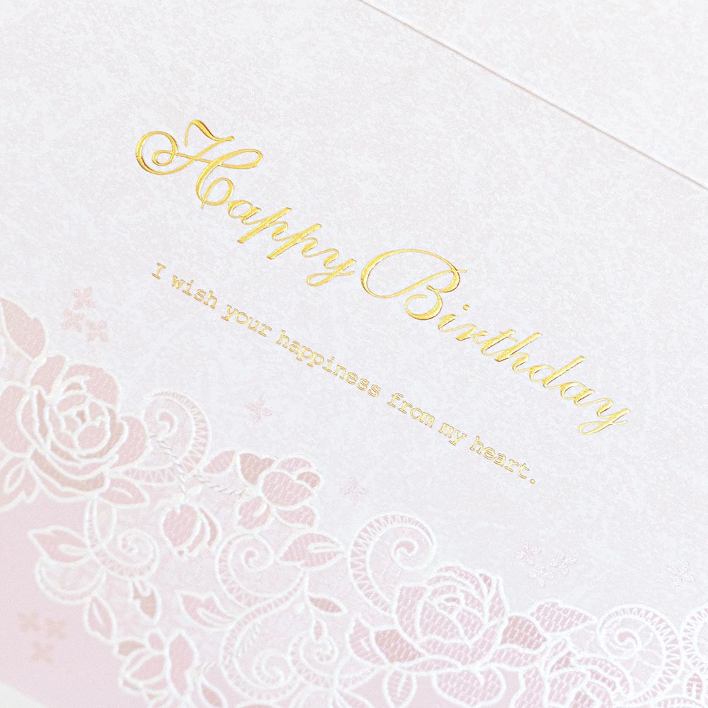 優しいピンクの色味と花束の様なバラのモチーフがフェミニンな印象のお誕生日カードです。