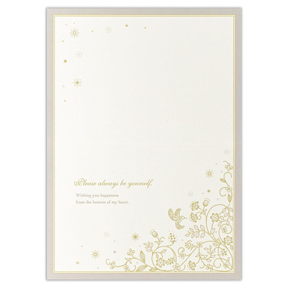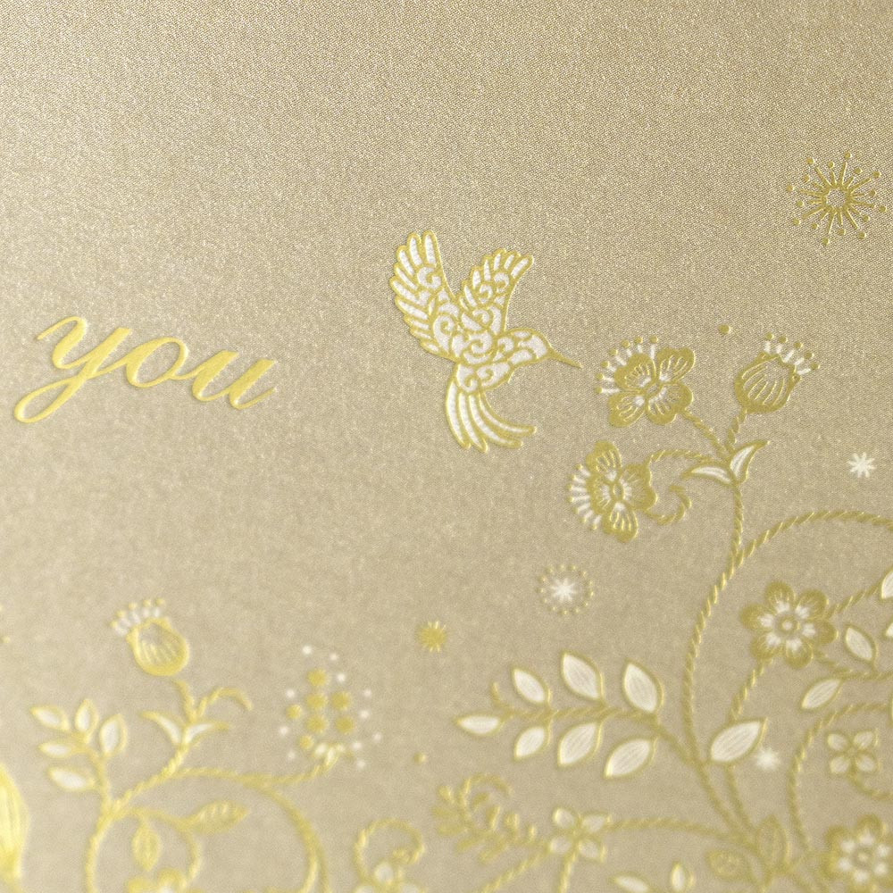 上品に輝くパール紙に可愛らしいハチドリや小花の絵柄に繊細な金箔押し加工を施した華やかな印象の多目的カードです。