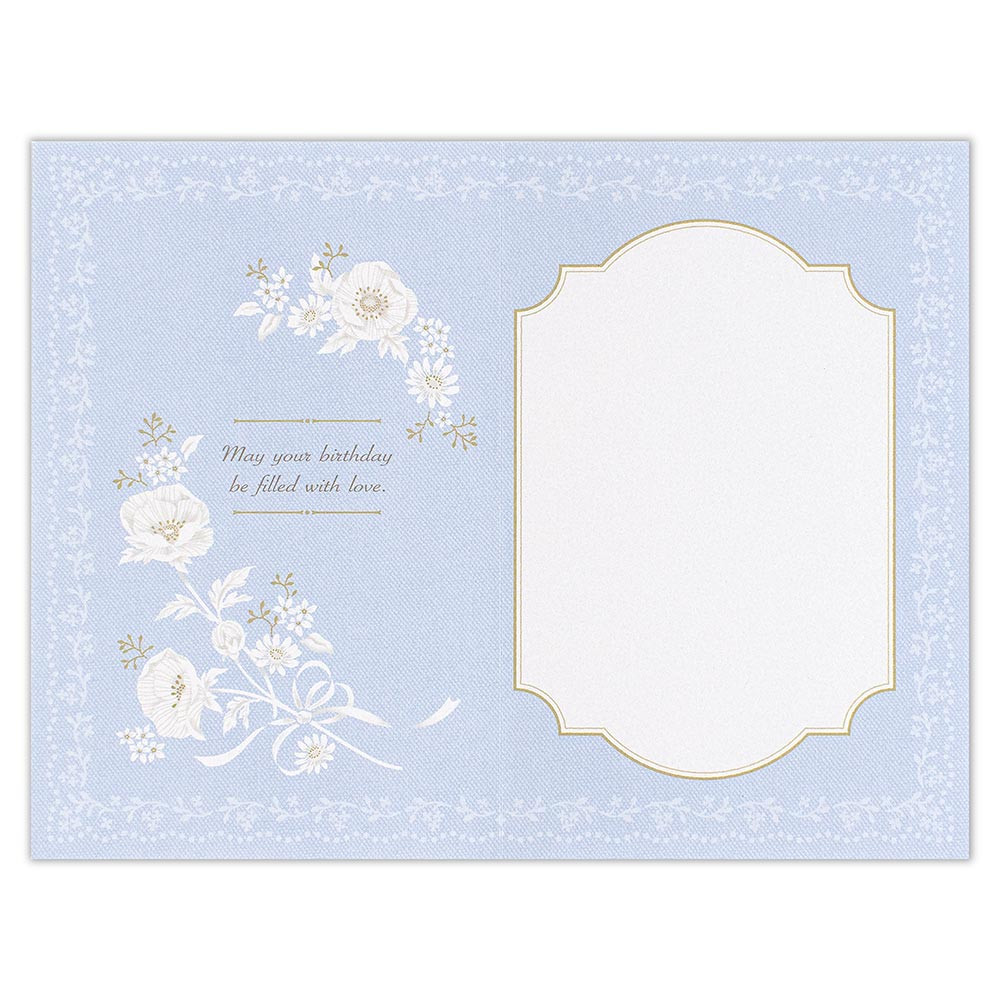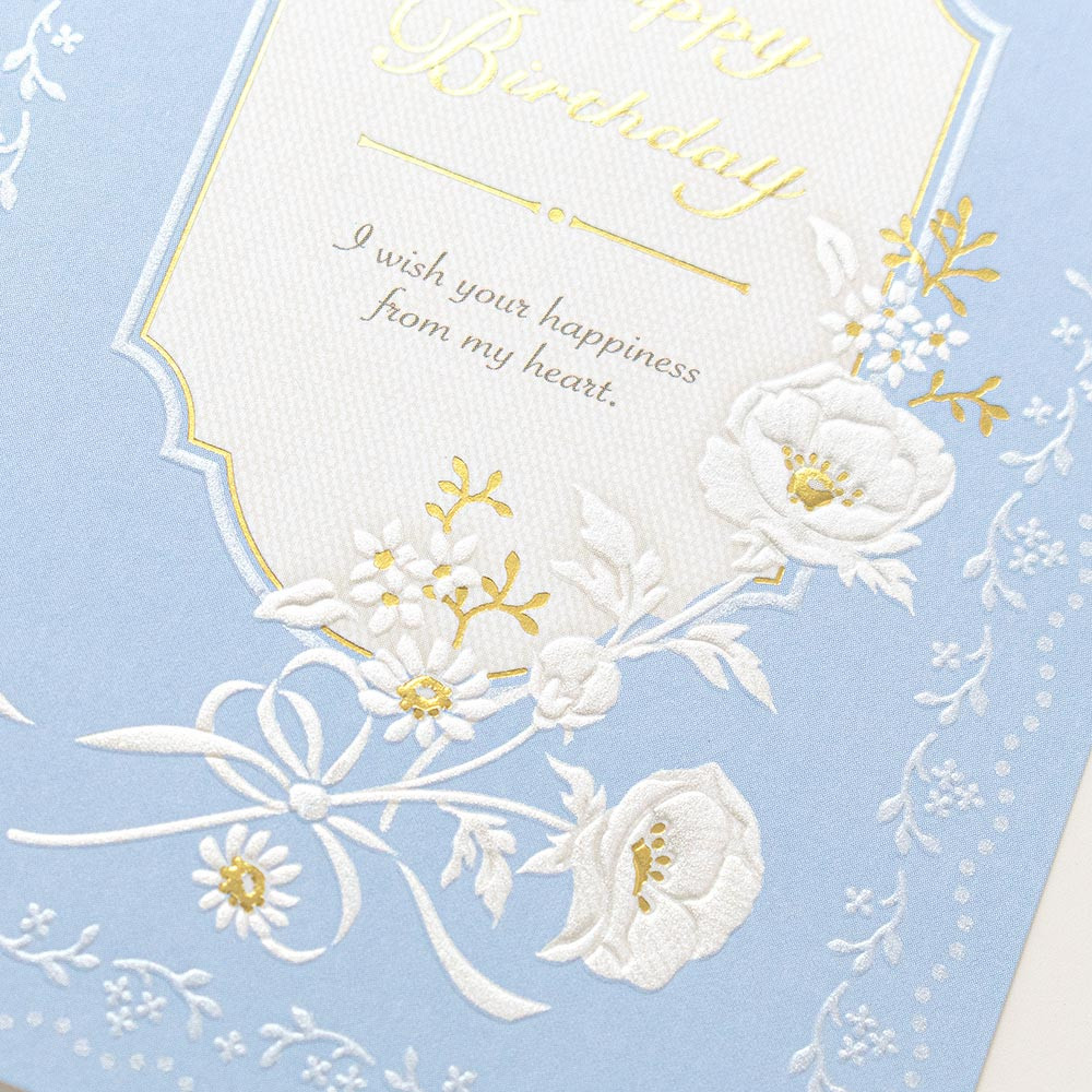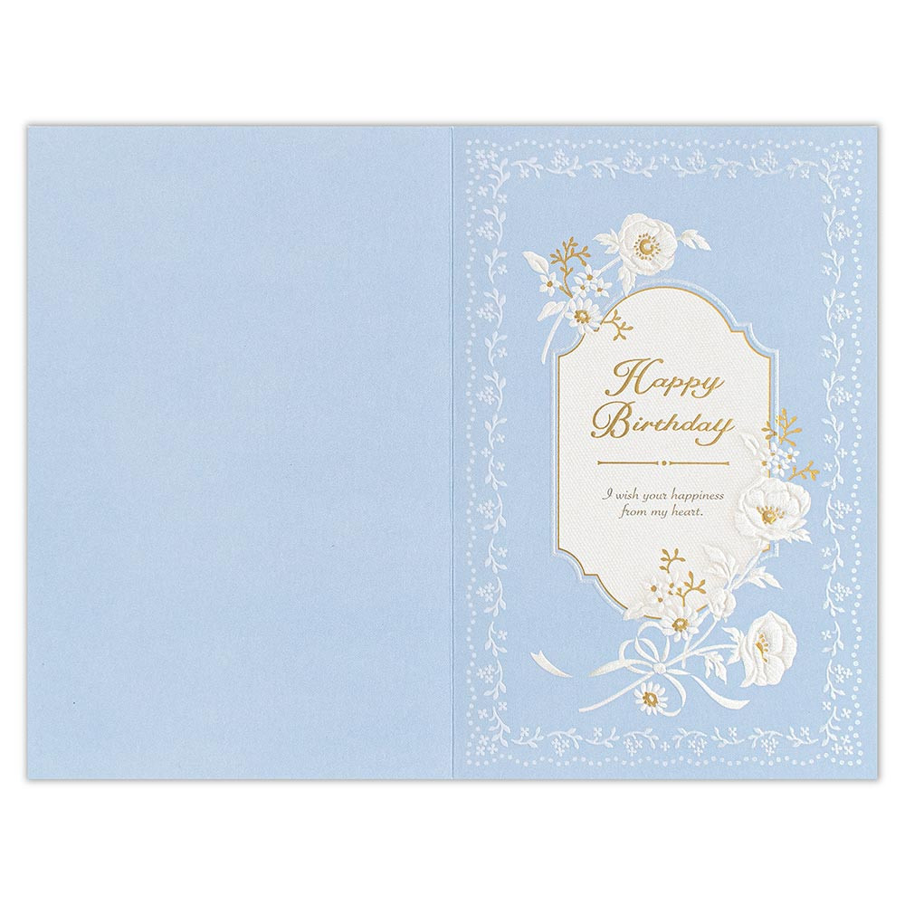 淡いブルー地に柔らかく輝く白い花々をあしらった上品なデザインの誕生日カードです。