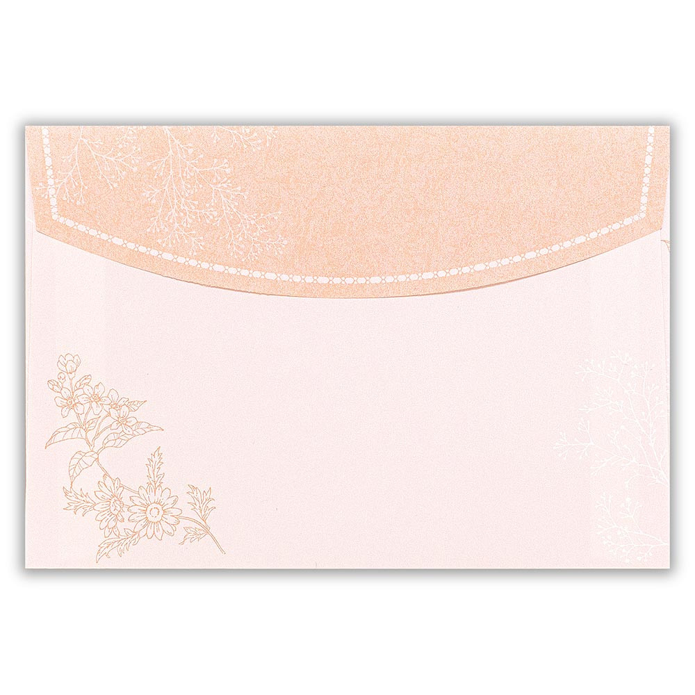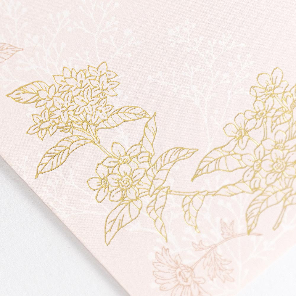 デイジーやブルースター、ペンタス、カスミソウを優しいピンクの色合いで描き繊細な金箔押し加工を施した華やかな印象の封筒です。