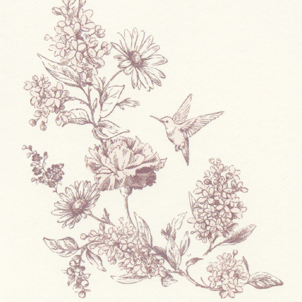 デイジー・ライラック・カーネーションの花の間を飛ぶハチドリが可愛らしいデザインです。