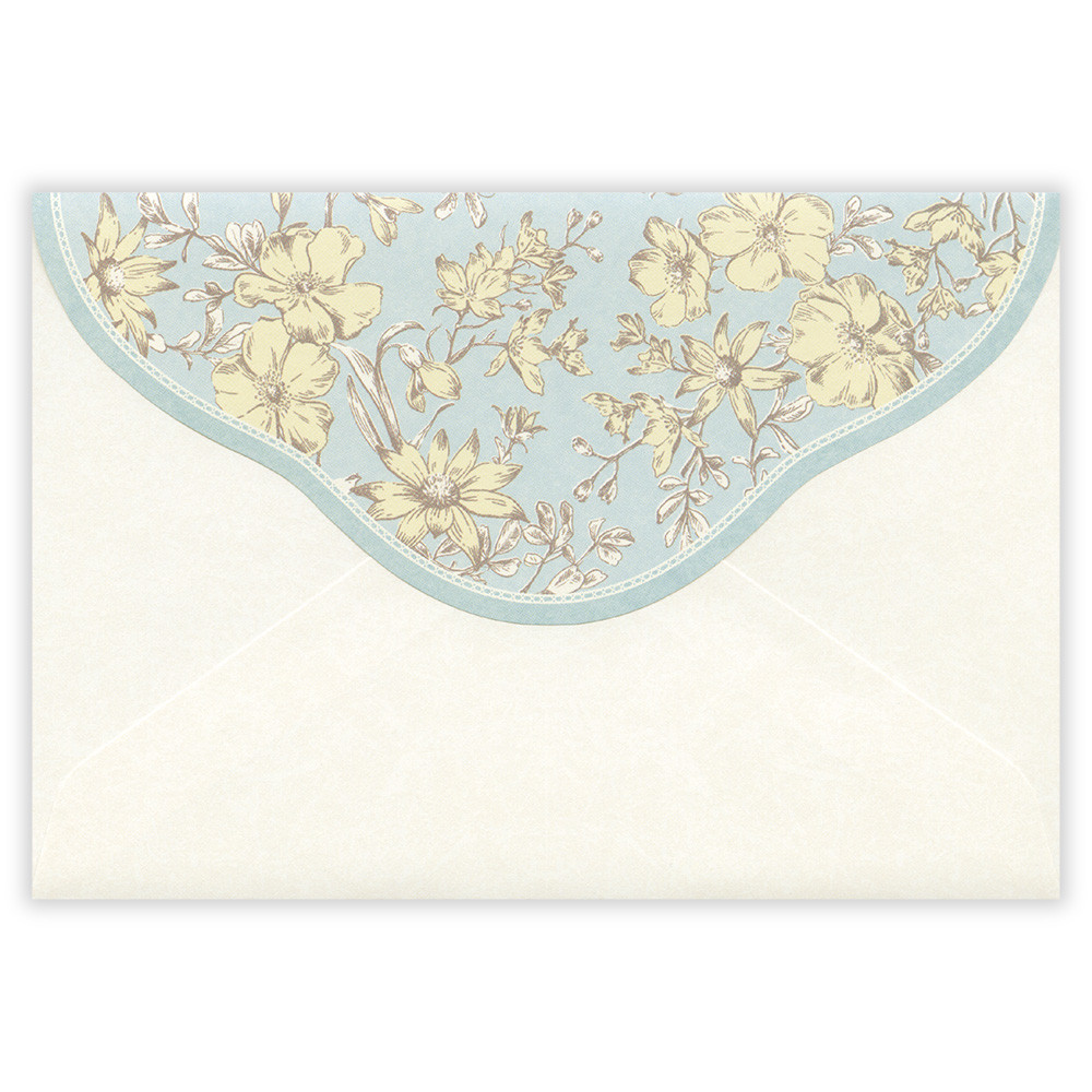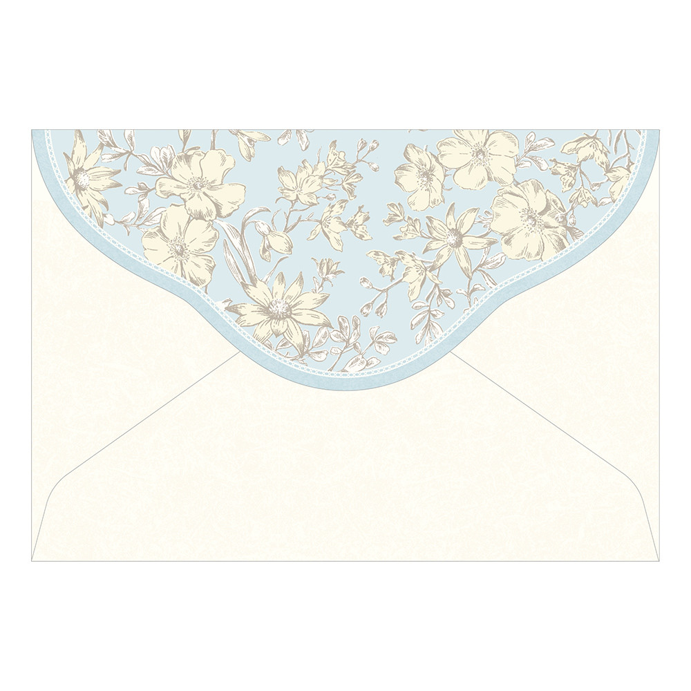 フランネルフラワーや一重咲きのバラ、デルフィニウム、スノードロップなどアンティーク風の花柄を繊細なタッチで描いた封筒です。