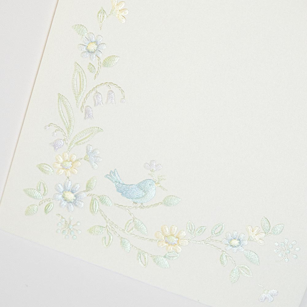 『幸せ』を意味する青い小鳥、ブルーデイジーの花やスズランなどの小花を可愛らしくデザインしました。
