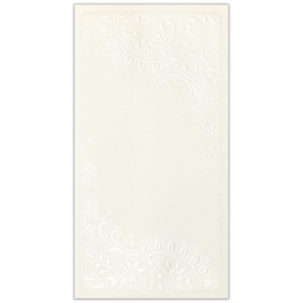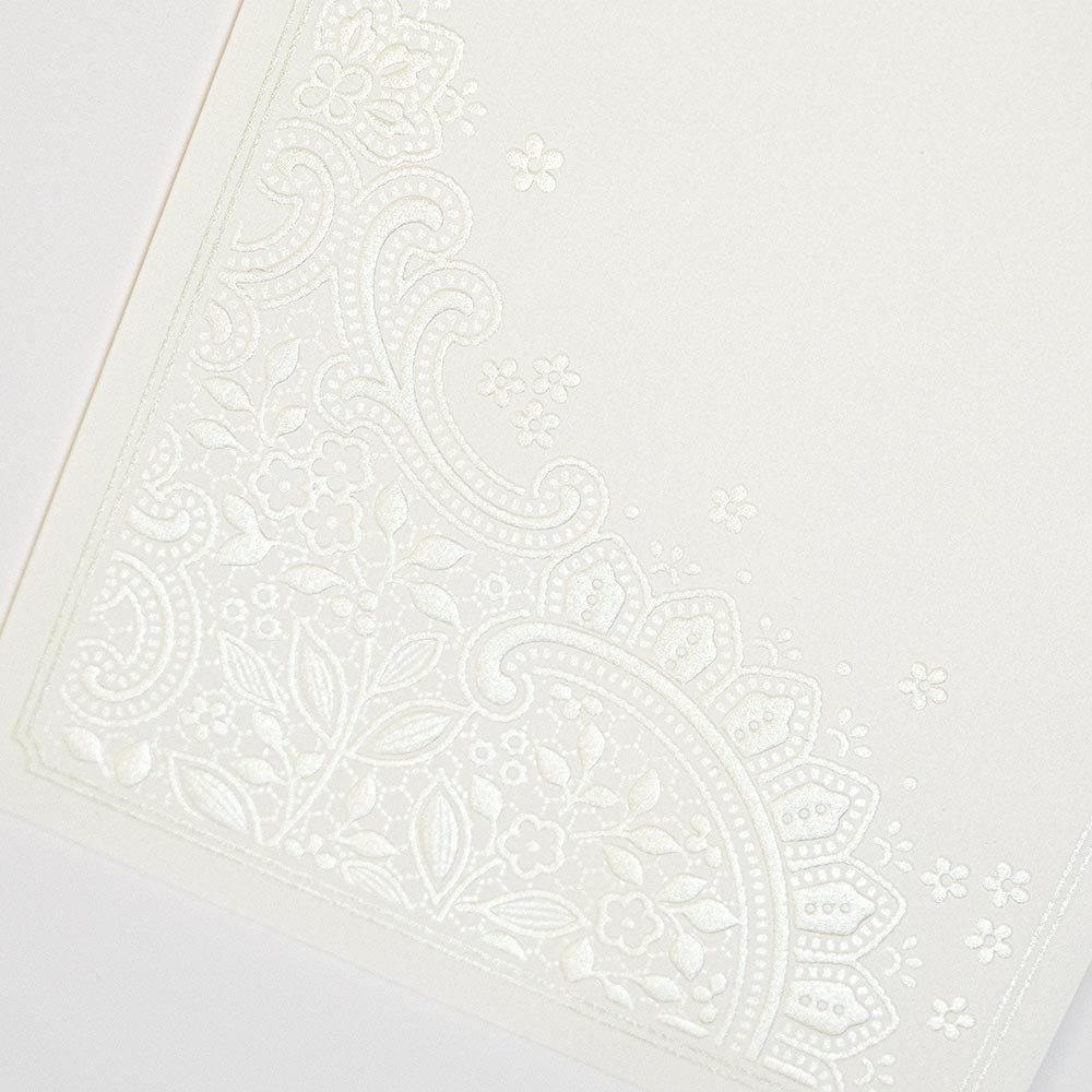 上品に輝くパールシルク印刷と丸みのあるエンボス加工を掛け合わせて刺繍とレースの絵柄を表現しました。