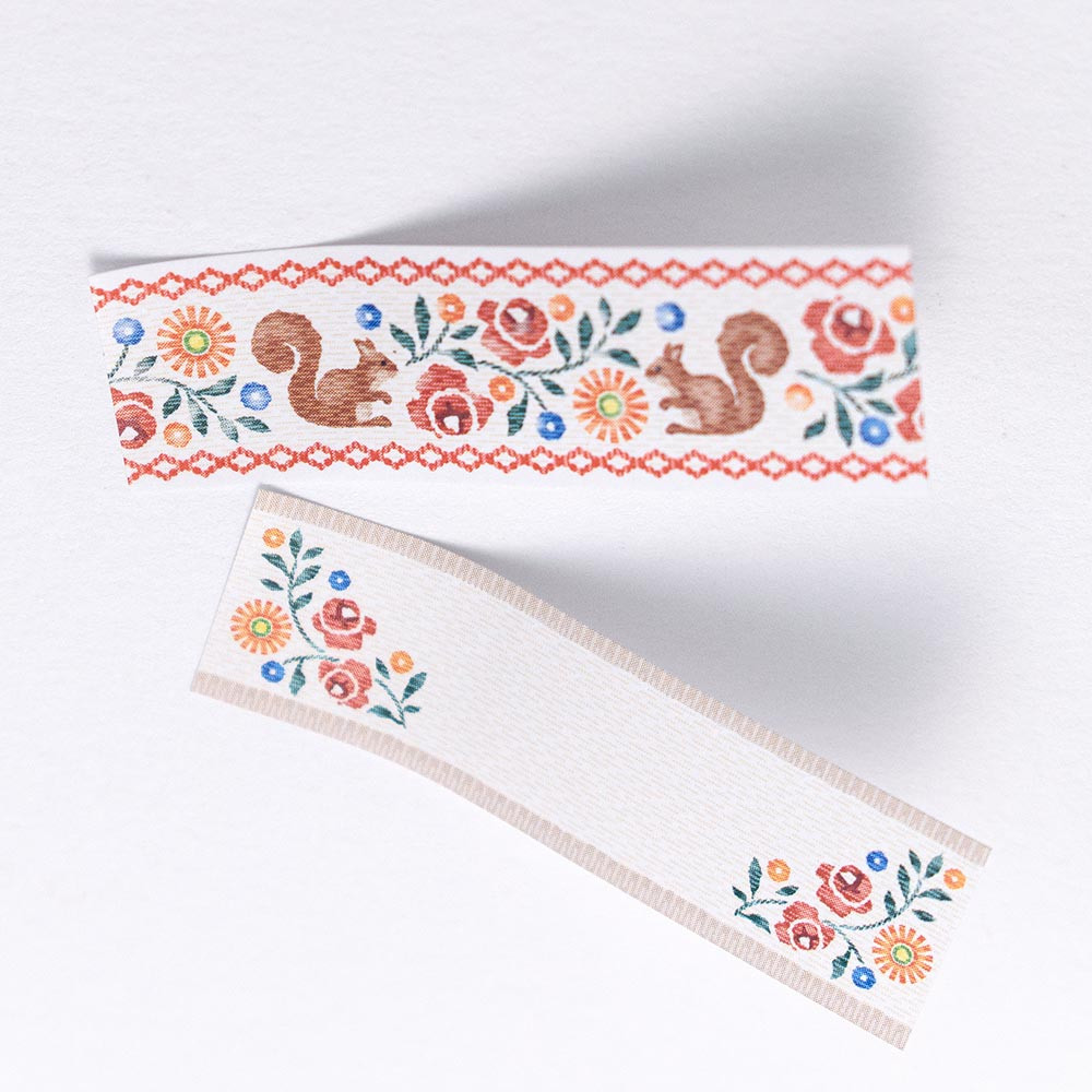 刺繍風のリスや赤い小花のリボン柄がデスク周りやノートなどを彩ります。