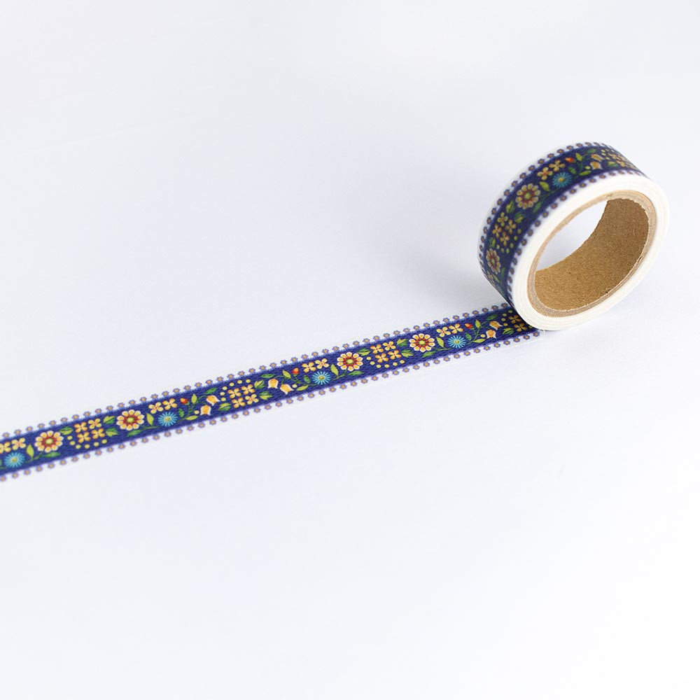 鮮やかなブルー地と刺繍風小花のリボン柄がお手紙や手帳などを可愛らしく彩ります。