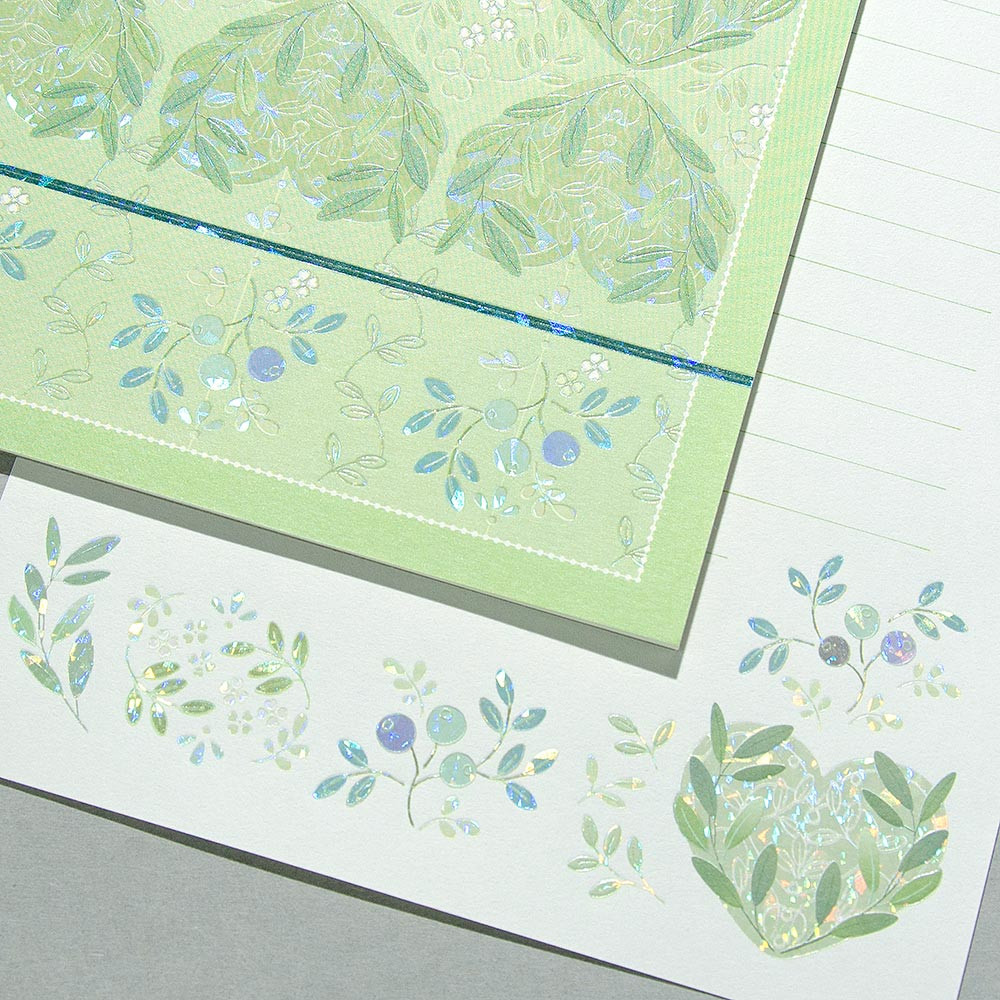 ブリーズ かろやかに輝く箔が上品な、大人のための便箋です。 おしゃれなグリーン系でまとめました。 爽やかに輝くイラストが文章を引き立てます。