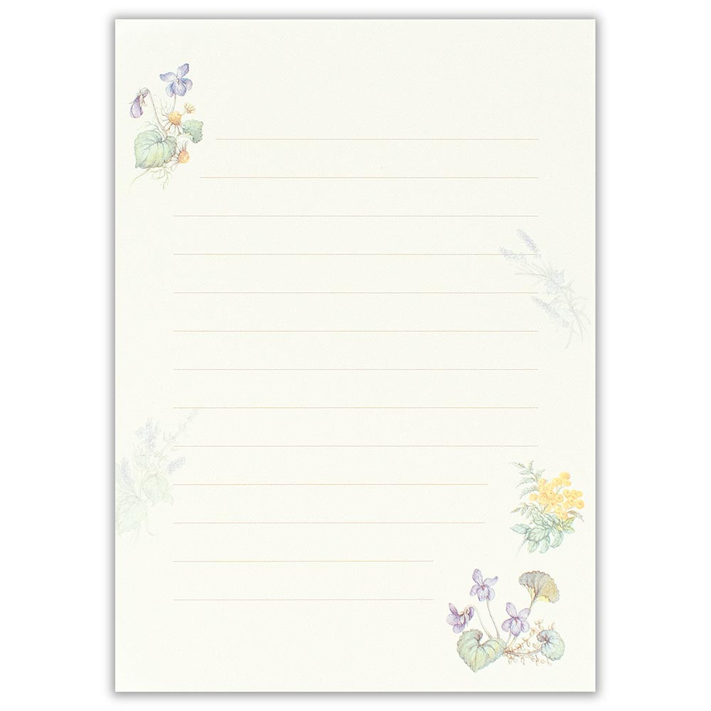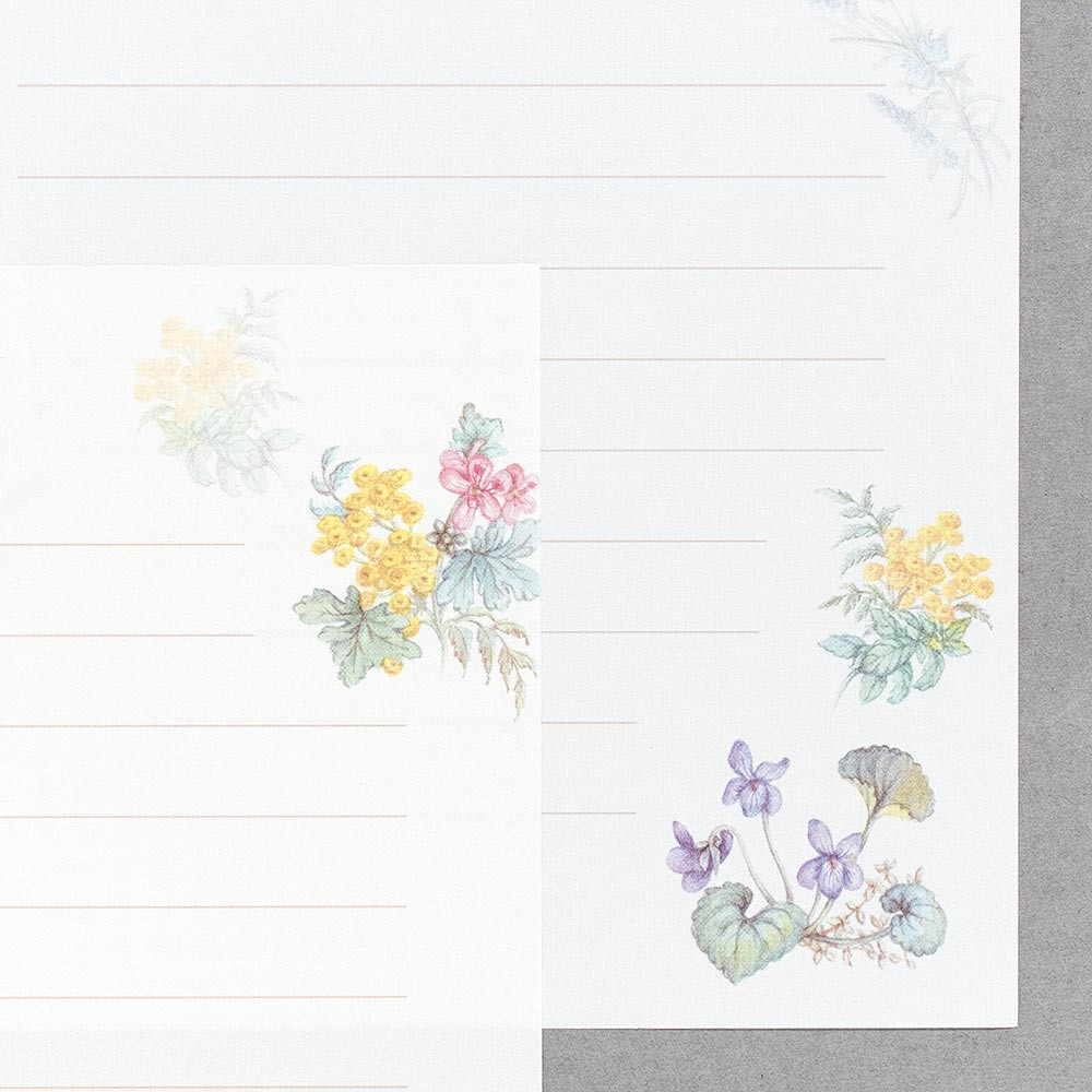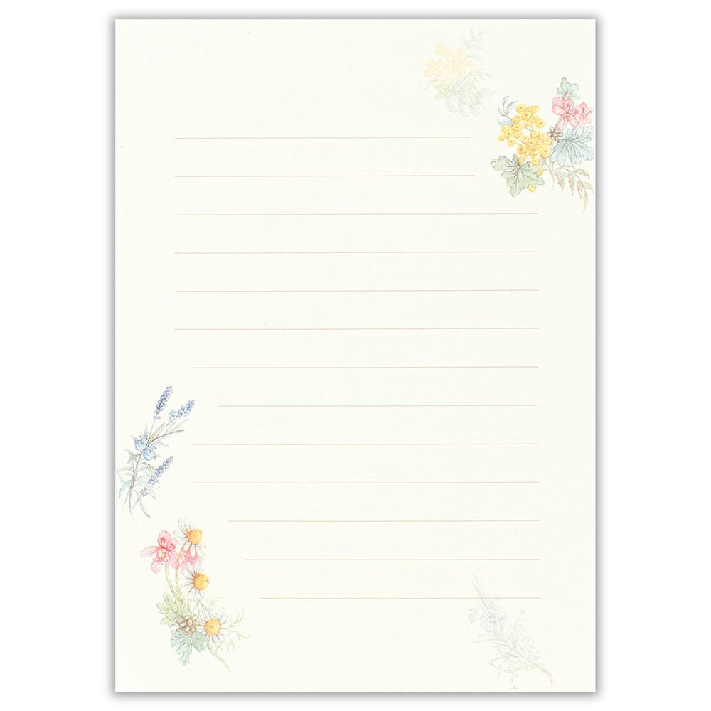 繊細に描かれたカモミール・ローズゼラニウム・ローズマリー・タイム・ニオイスミレ・タンジー・バジル・ミント・ラベンダーが文章を彩ります。