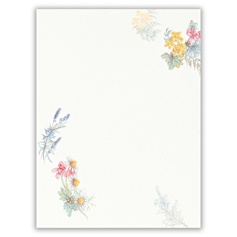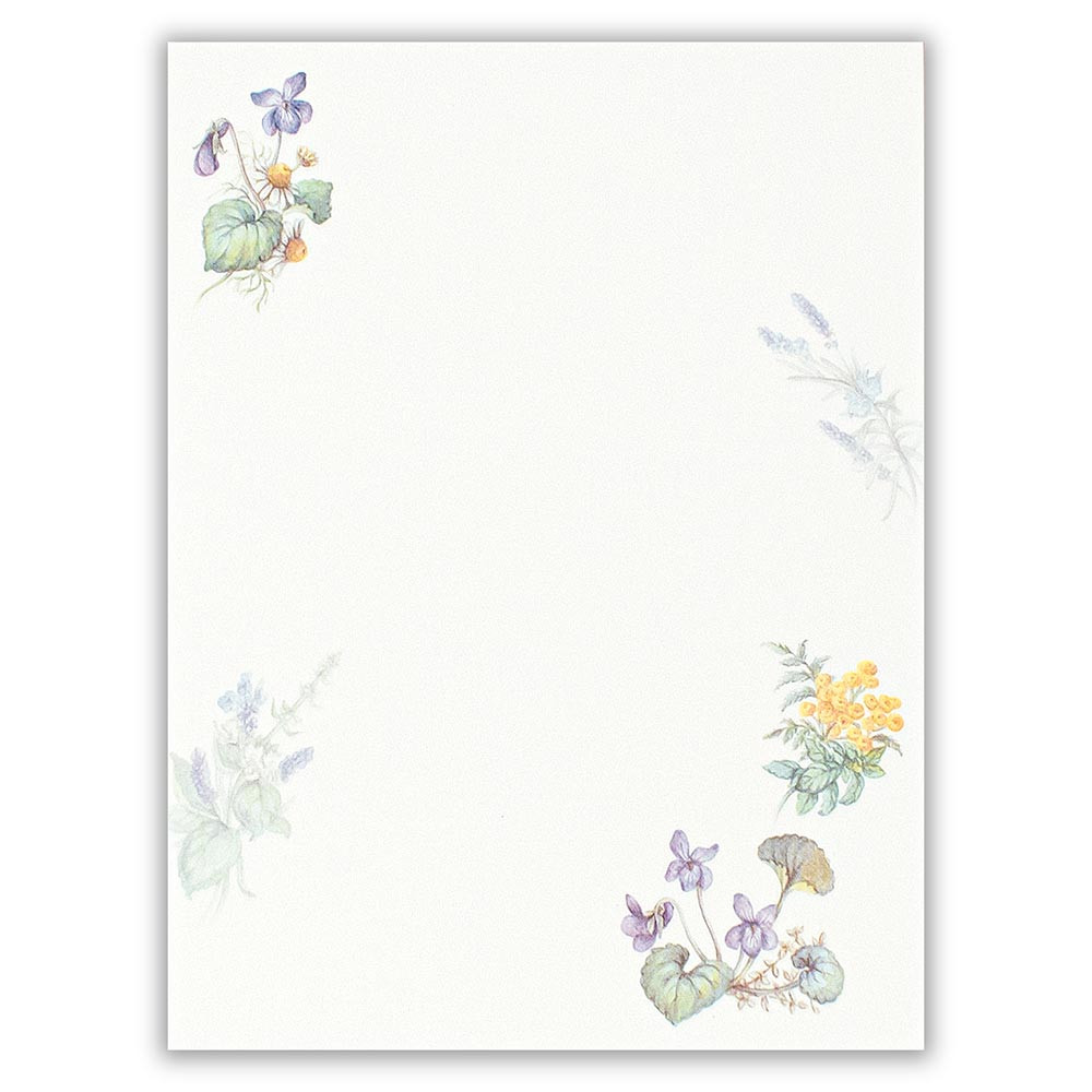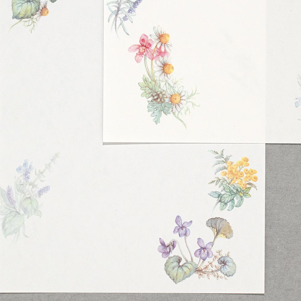 繊細に描いたカモミール・ローズゼラニウム・ローズマリー・タイム・ニオイスミレ・タンジー・バジル・ミント・ラベンダーが彩ります。