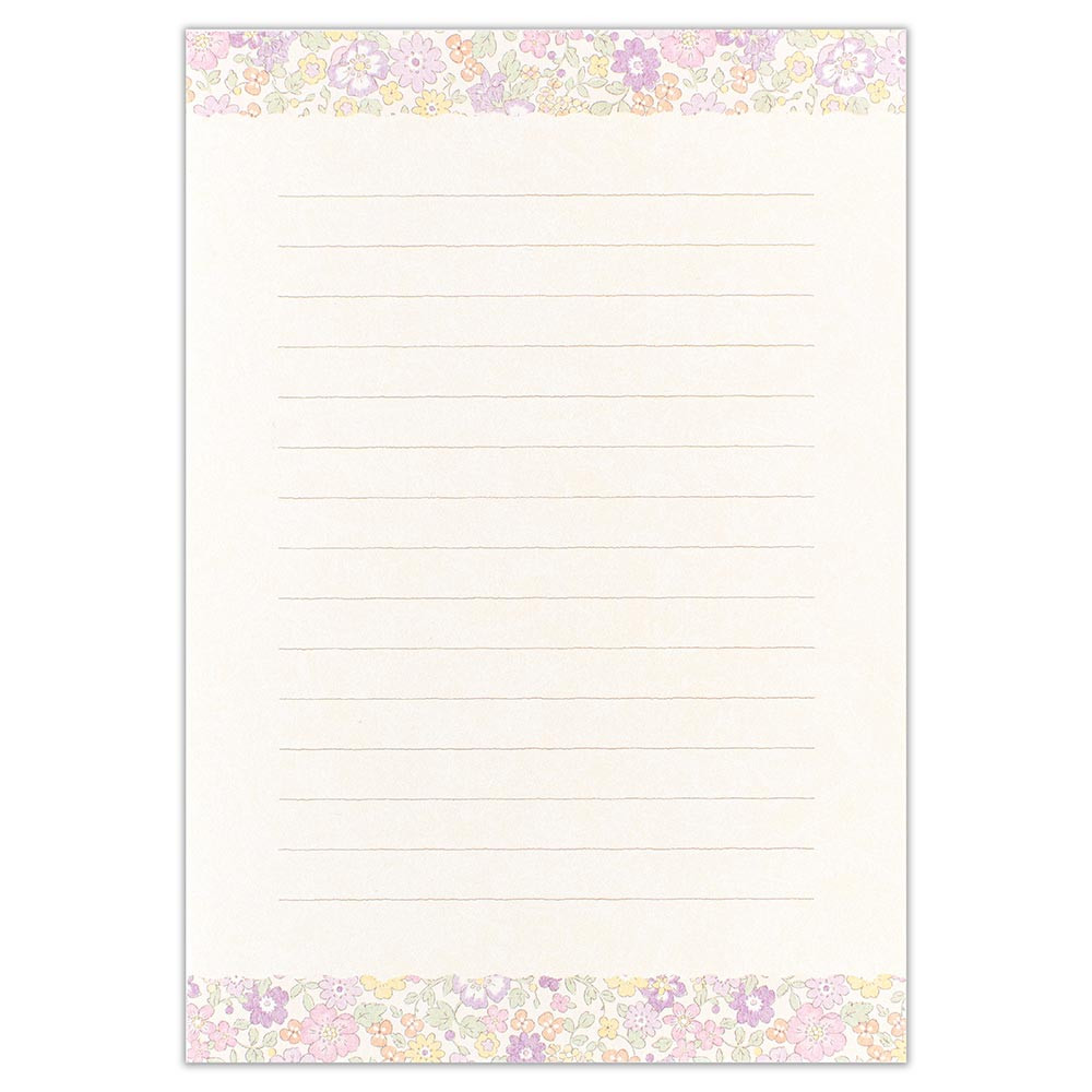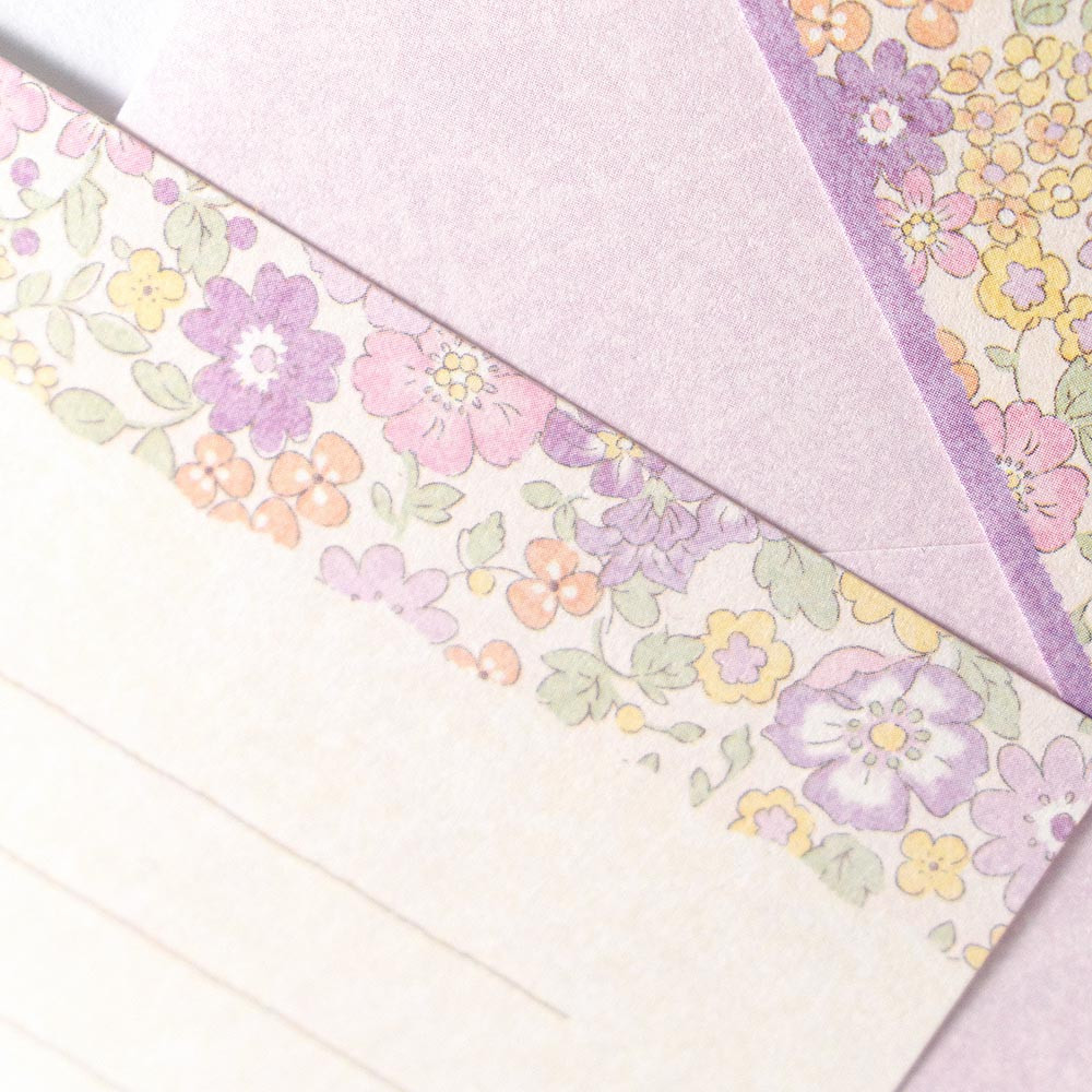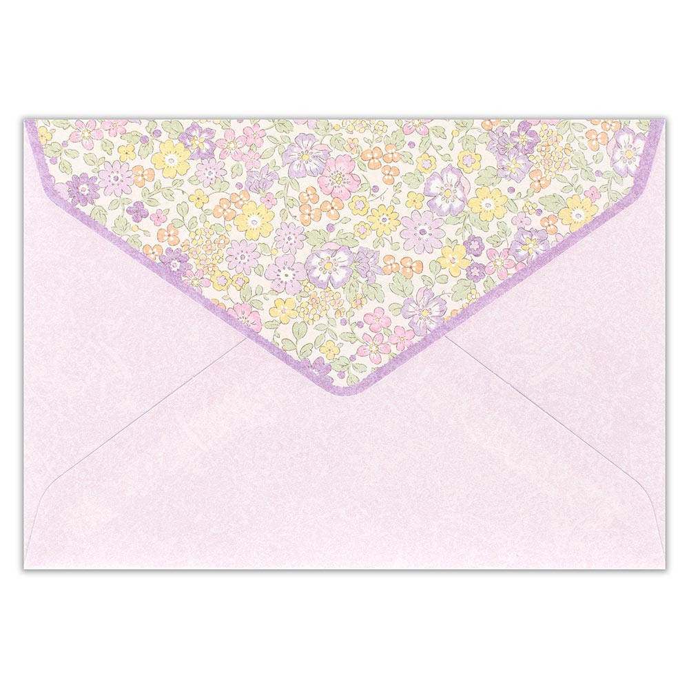 柔らかいライラックカラーの花々とイエロー、オレンジの小花が優しく可愛らしい印象のデザインです。