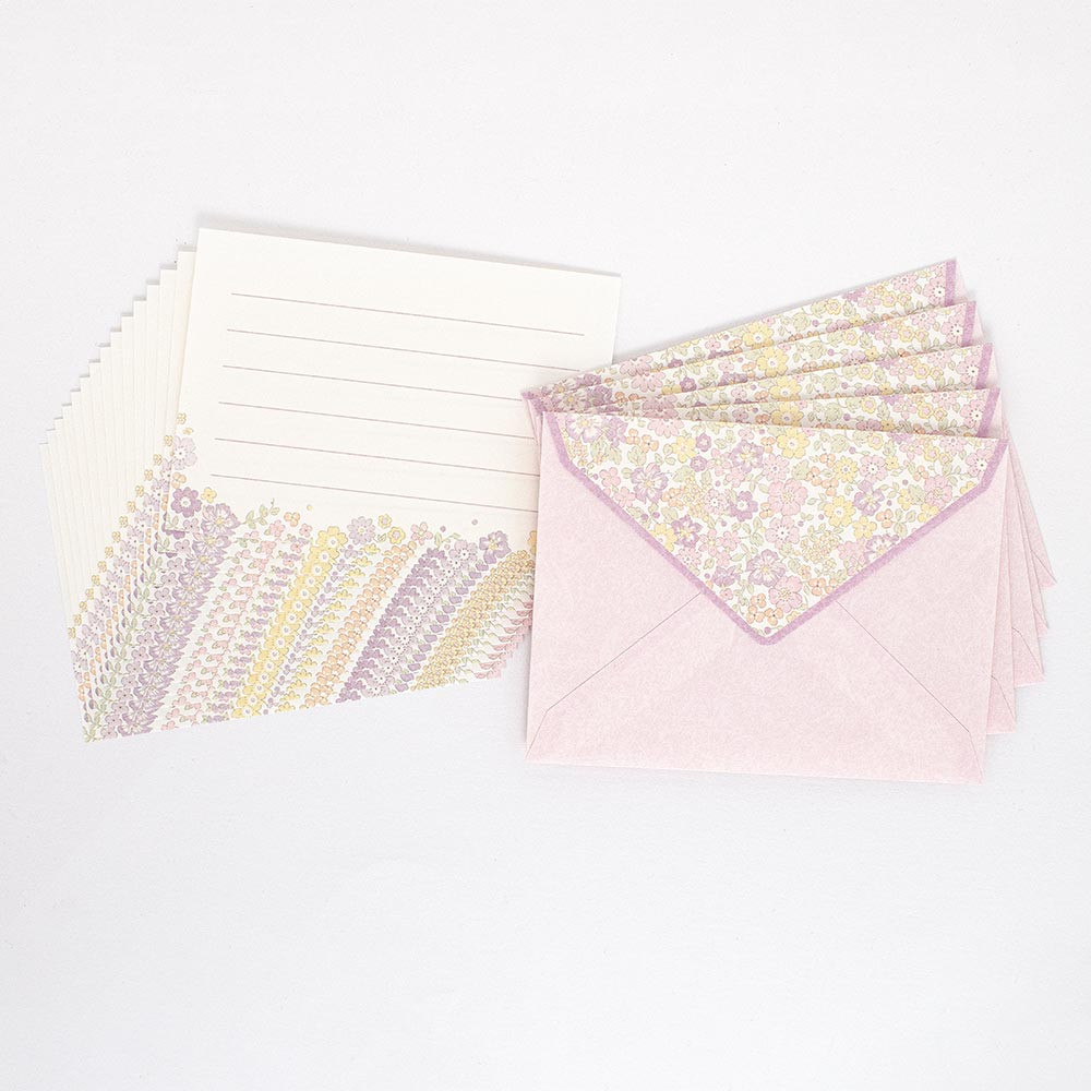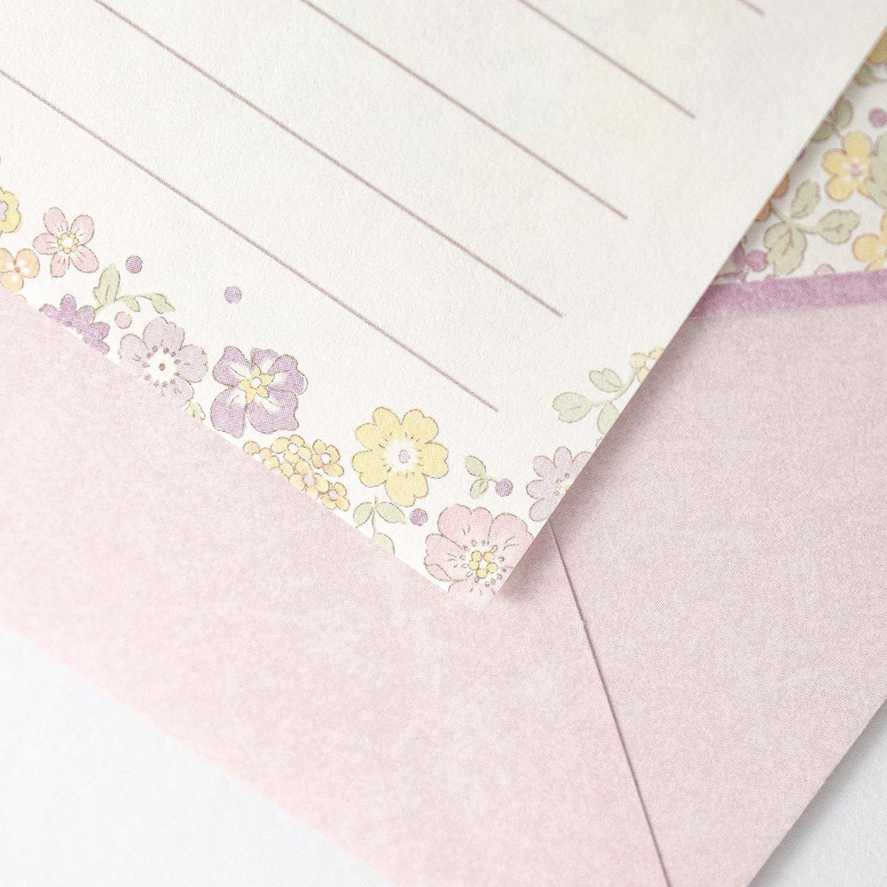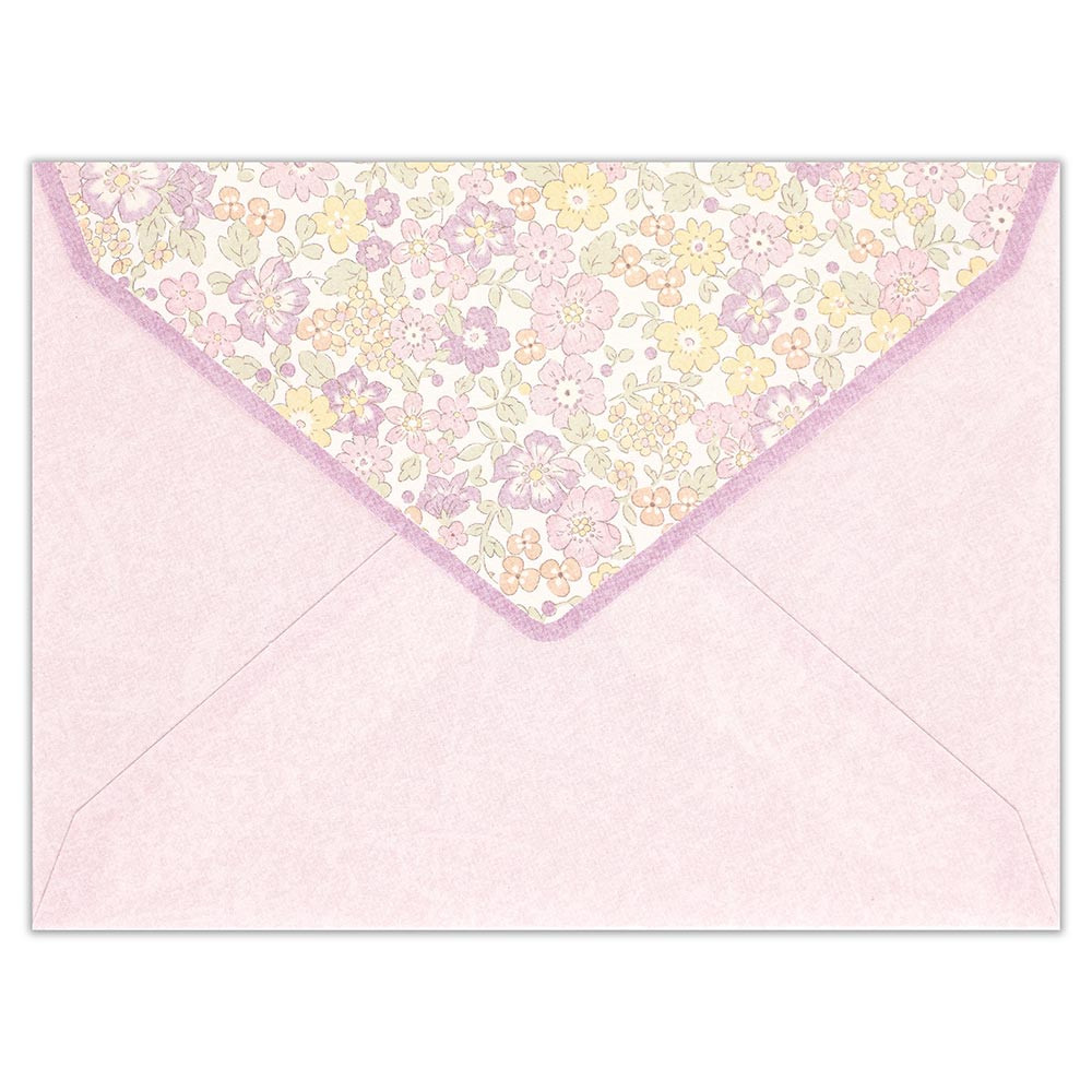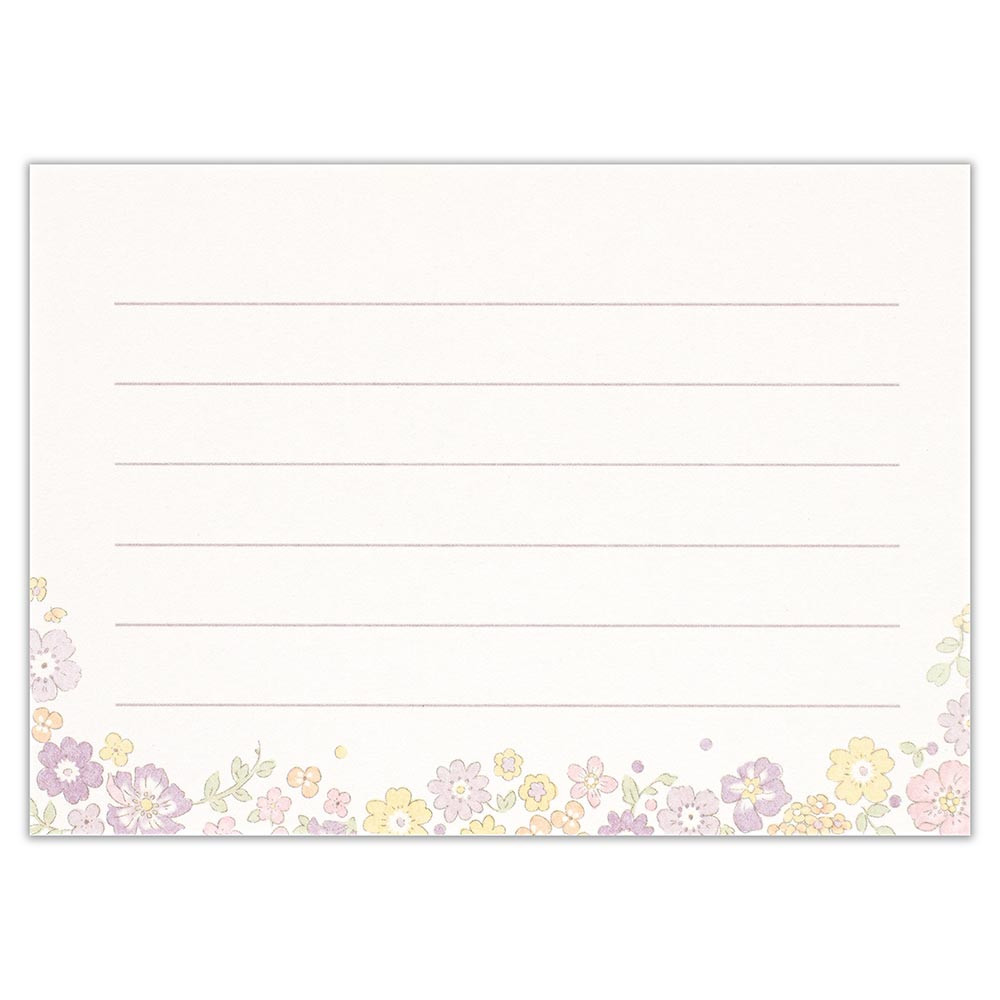 柔らかいライラックカラーの花々とイエロー、オレンジの小花が優しく可愛らしい印象のデザインです。