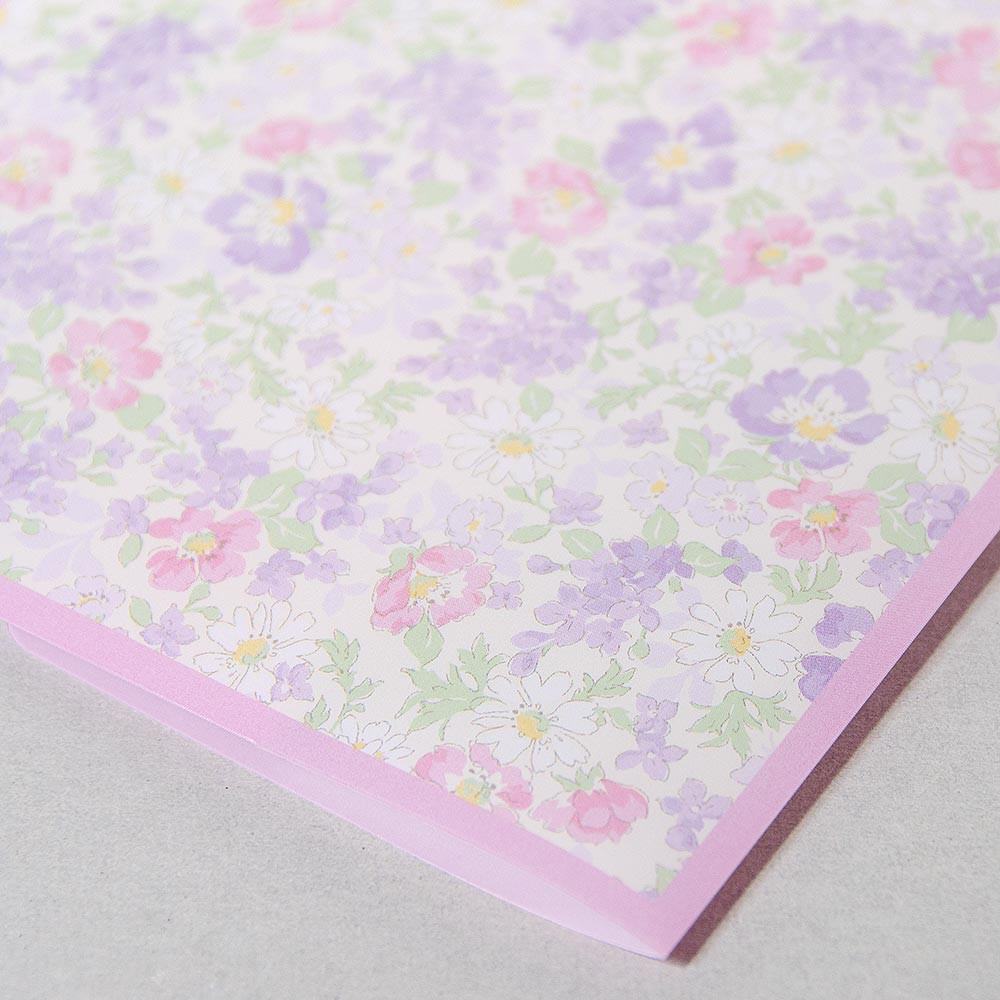 ライラックとピンクの花々に落ち着いたイエローグリーンの葉の色を合わせた、甘すぎず優しい印象です。