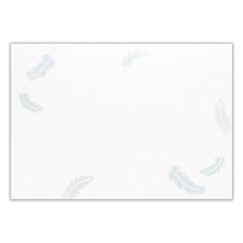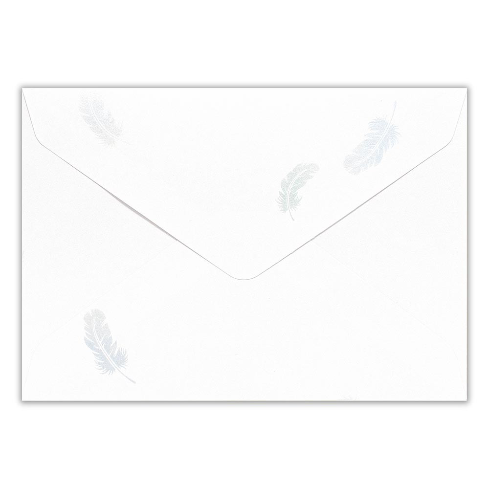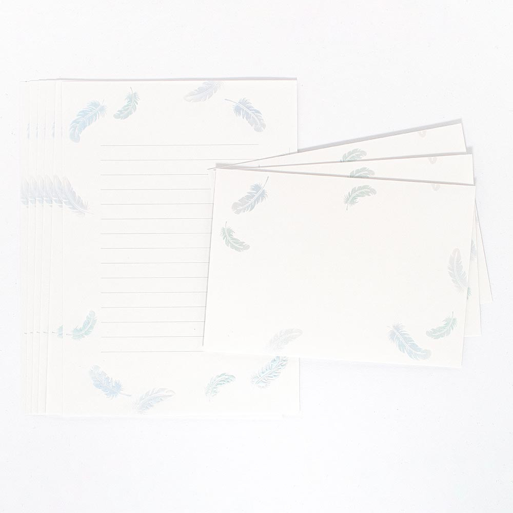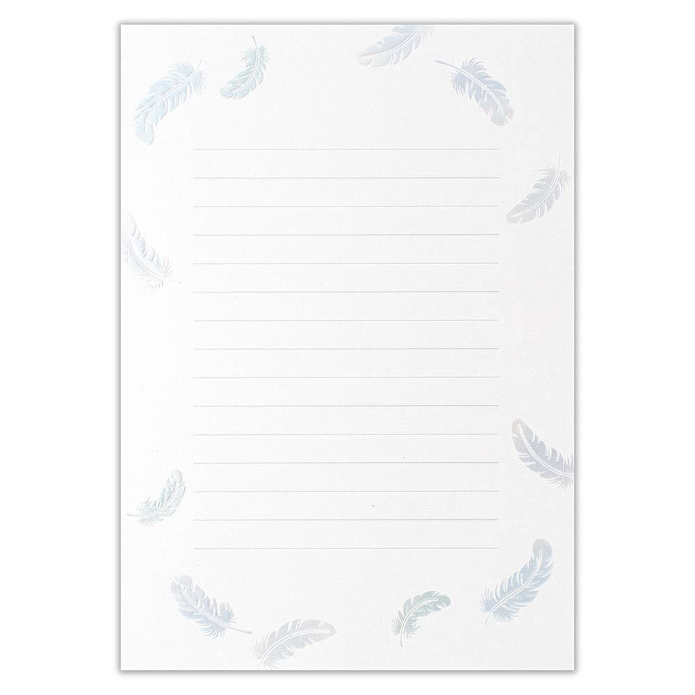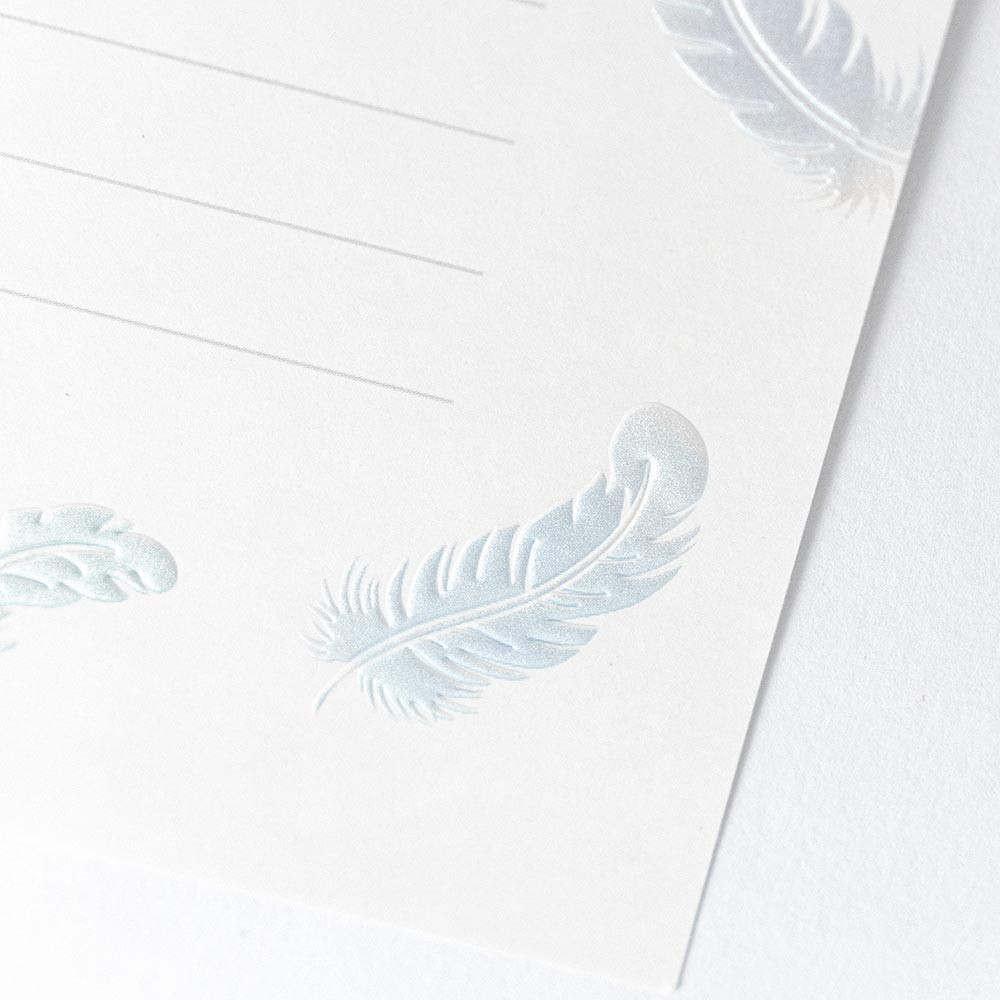 パールの輝きが上品なA5レターセットです。便箋にはエンボス加工が入っています。舞う羽根を水色系でまとめ、幅広い用途にお使いいただけるデザインに仕上げました。