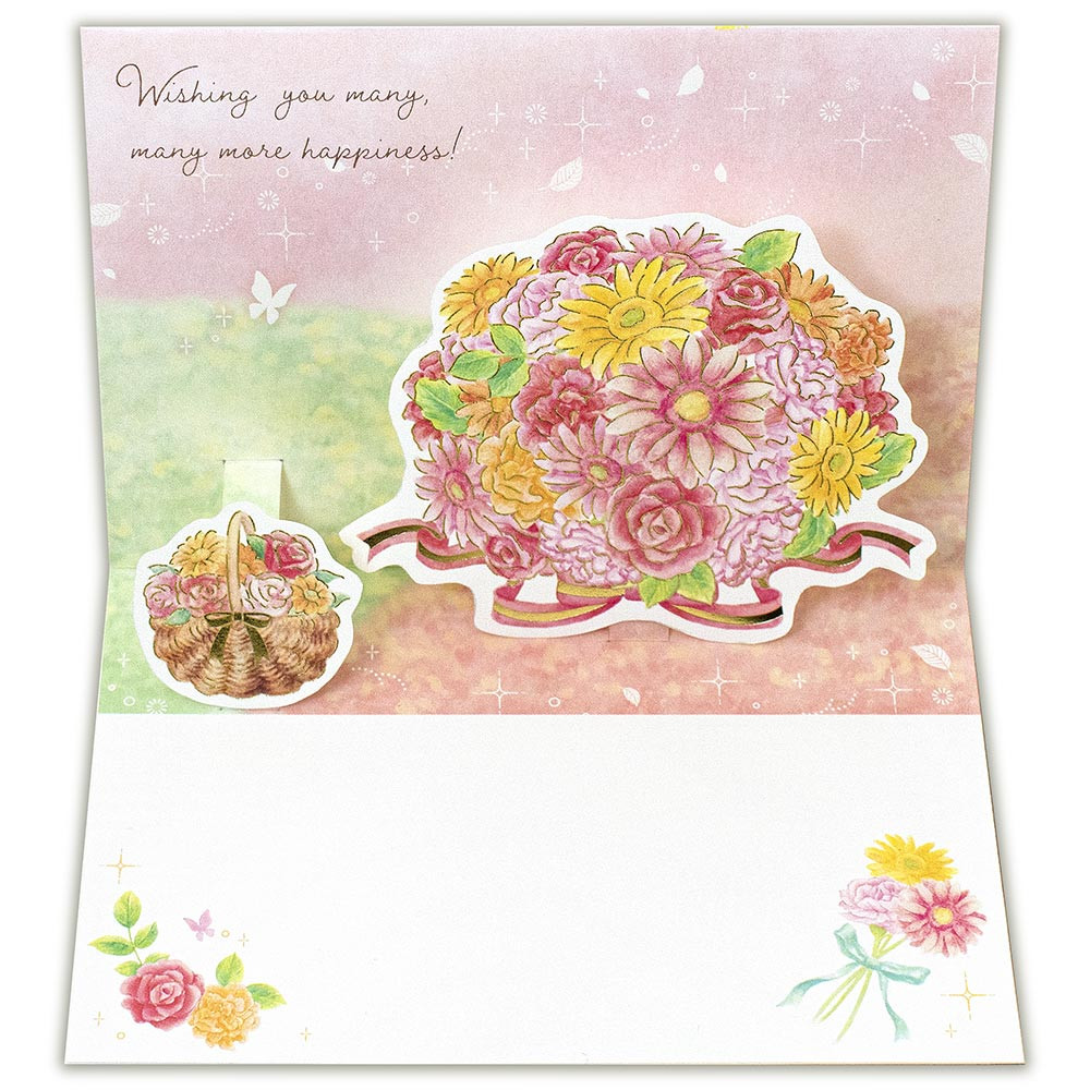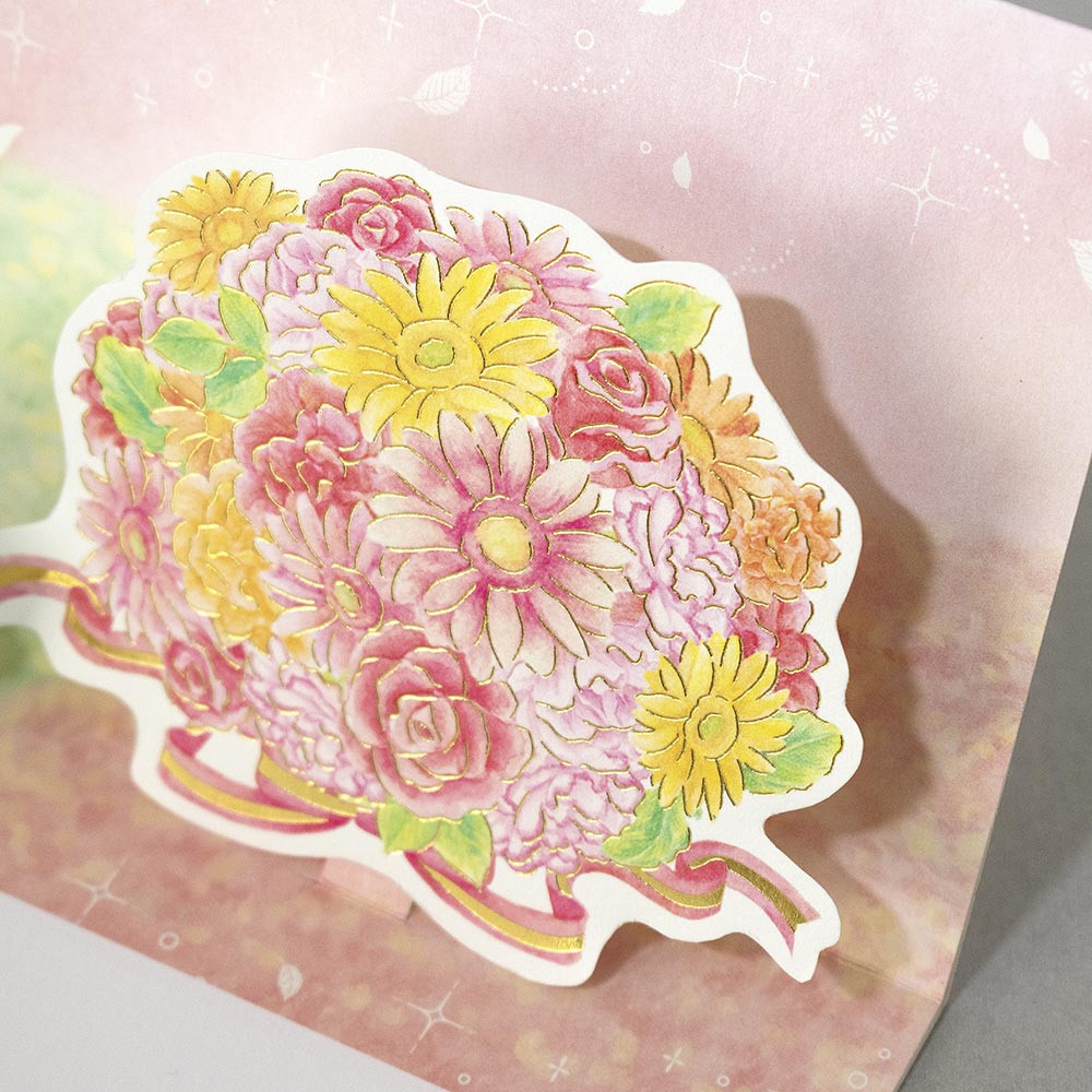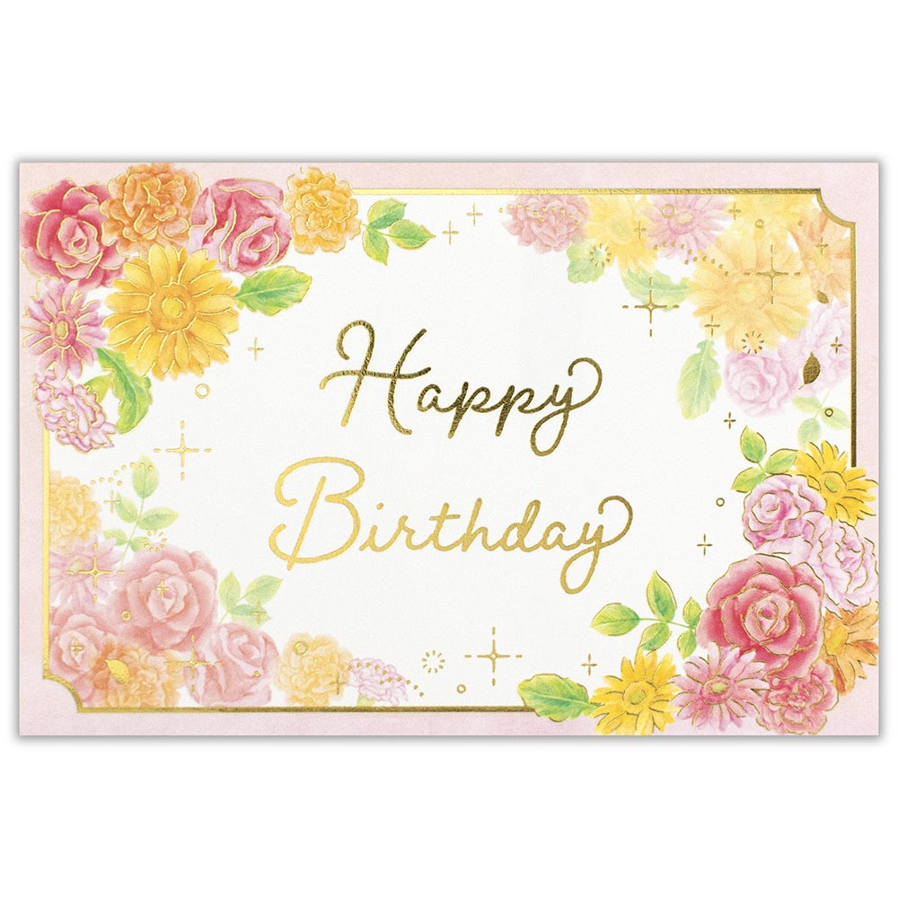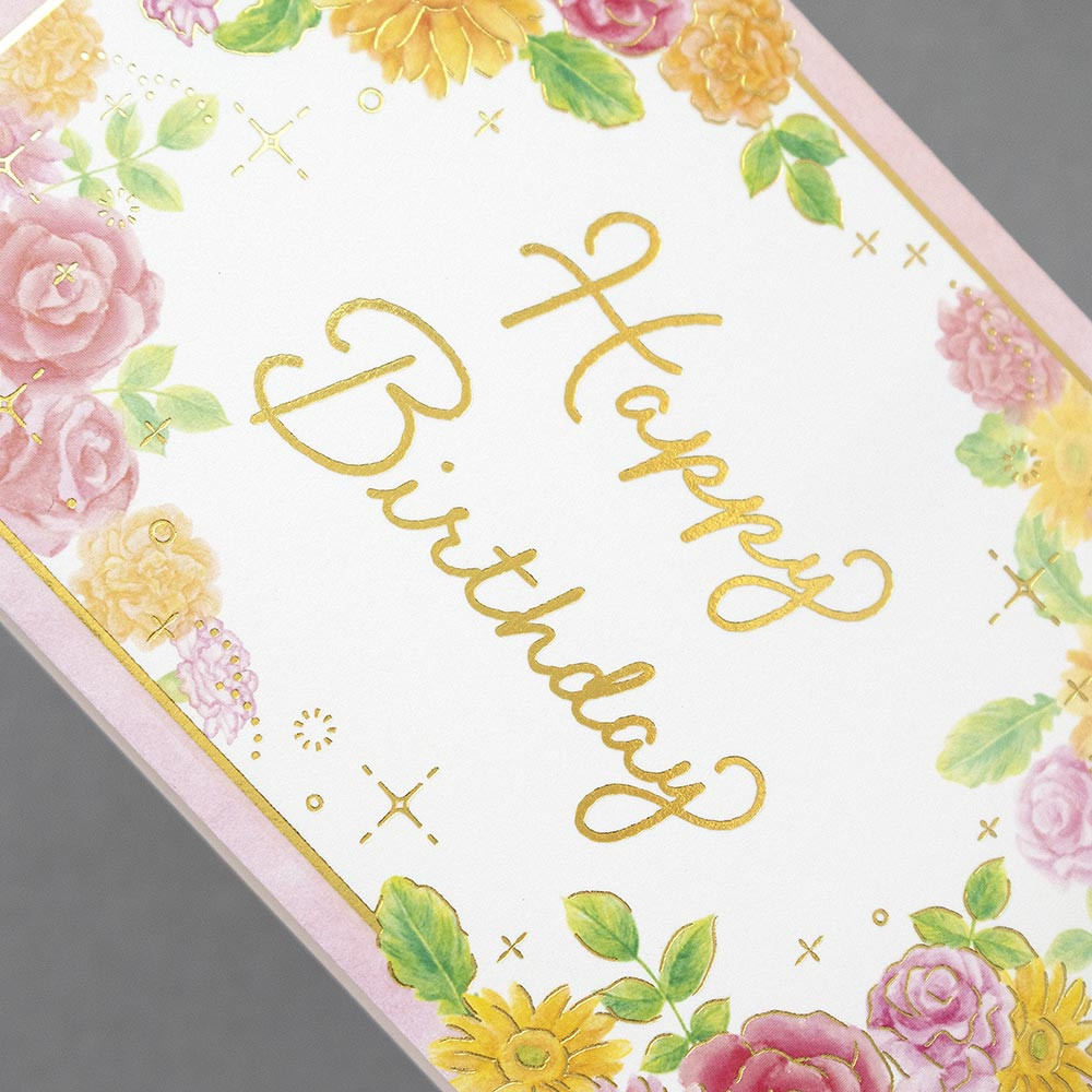 立体パーツが華やかなバースデーカードです。金箔押し加工がきらりと輝きます。
