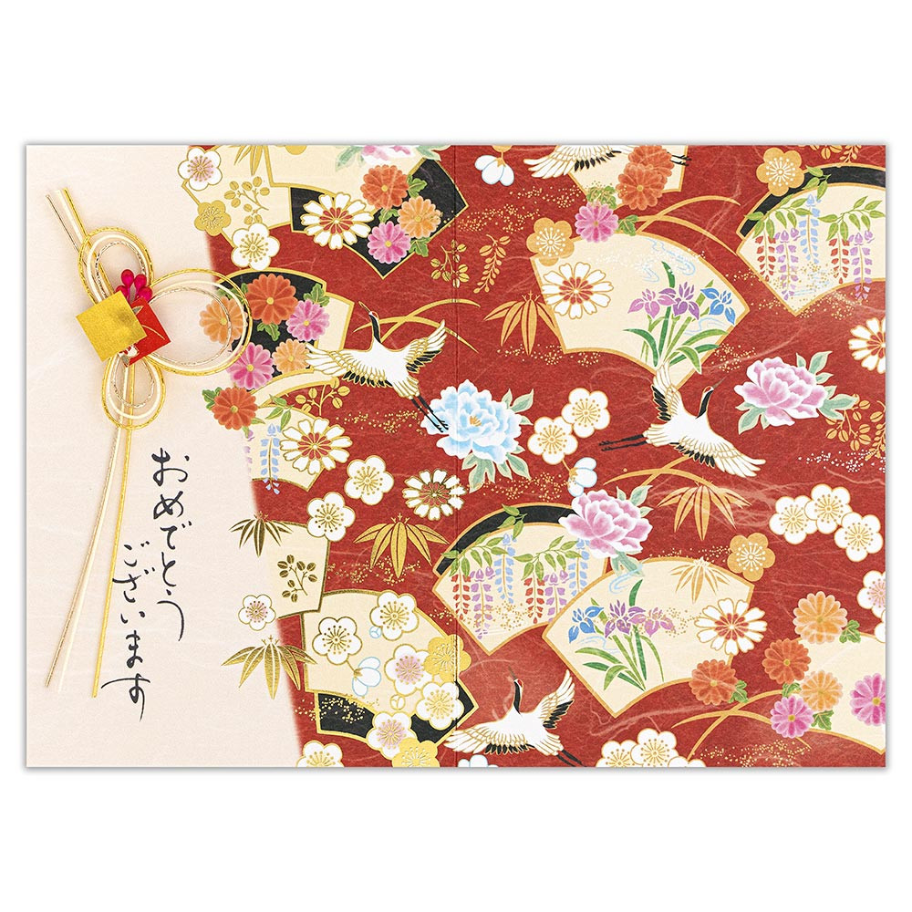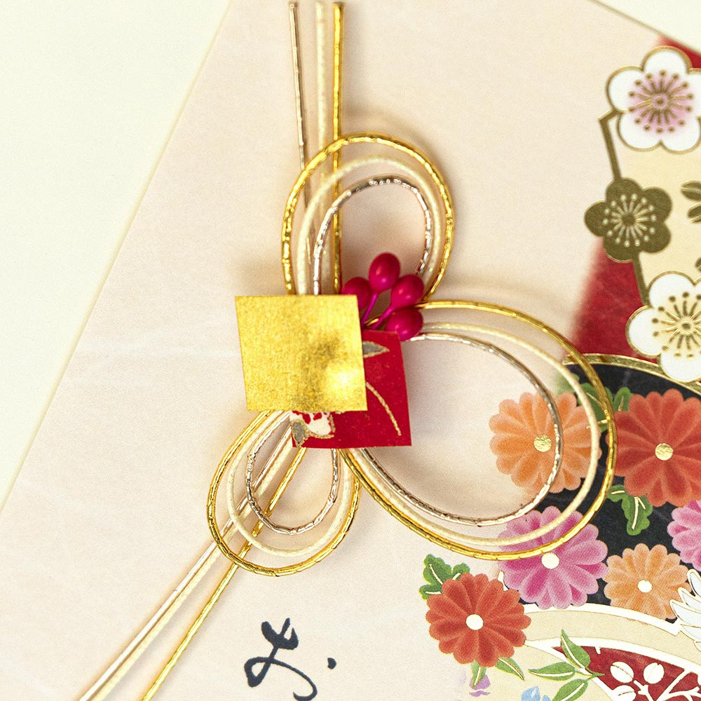 華やかな水引飾りと金箔押し加工が目を引く、和風のお祝いのカードです。幅広いシーンでお使いいただけます。