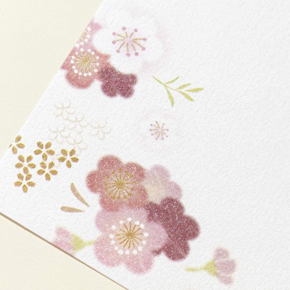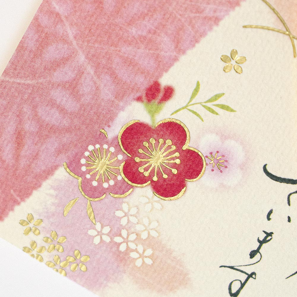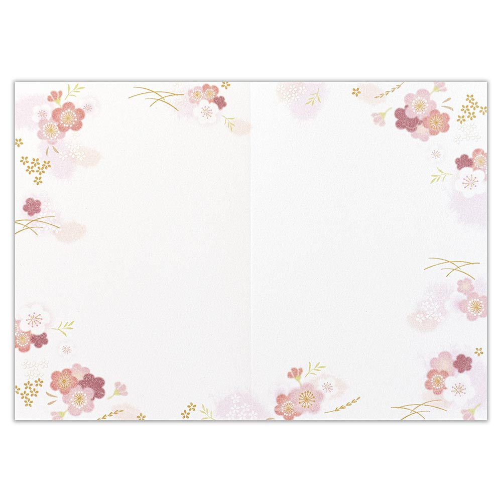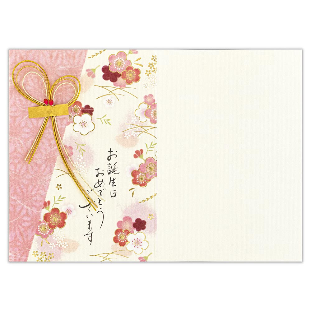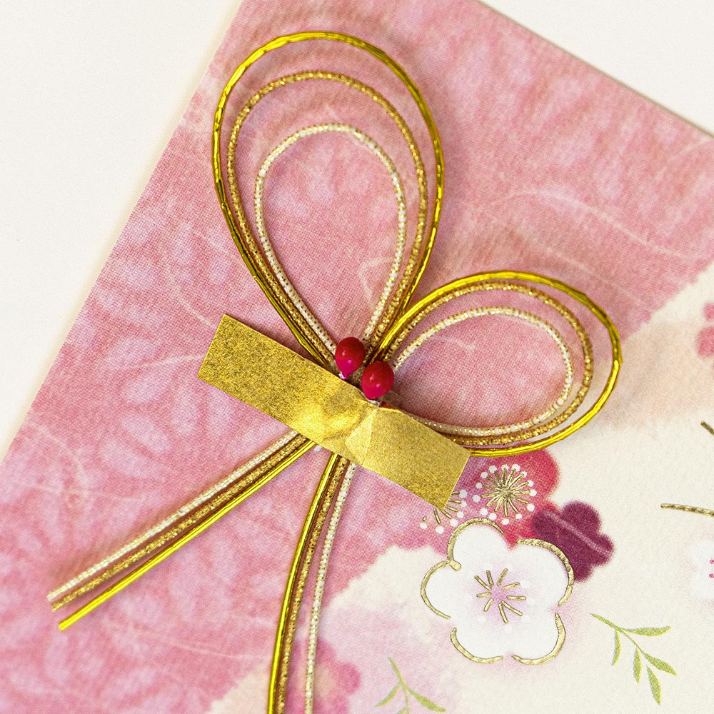 華やかな水引飾りと金箔押し加工が目を引く、和風のバースデーカードです。やわらかな梅の花と金箔を使い、お祝いの気持ちが伝わる雰囲気に仕上げました。中紙にも絵柄が入っています。