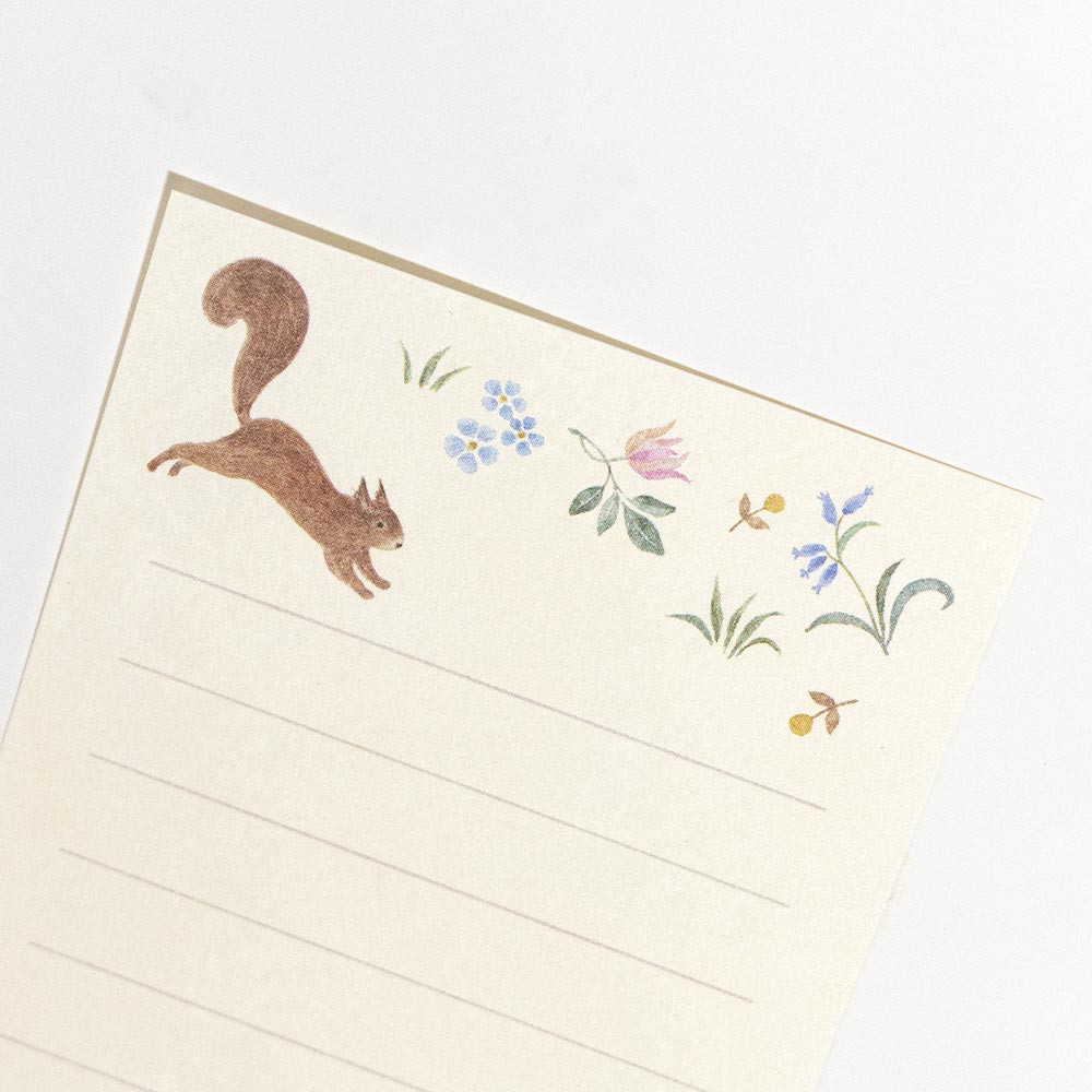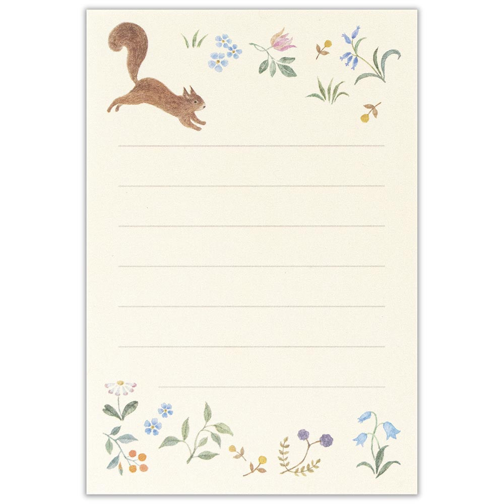 リスと花々がモチーフの、おしゃれなミニミニサイズのレターセット。プレゼントに添えたり、ひとこと気持ちを伝えたり、カジュアルなシーンで使えます。心が弾む、手触りのいい和紙を使用。