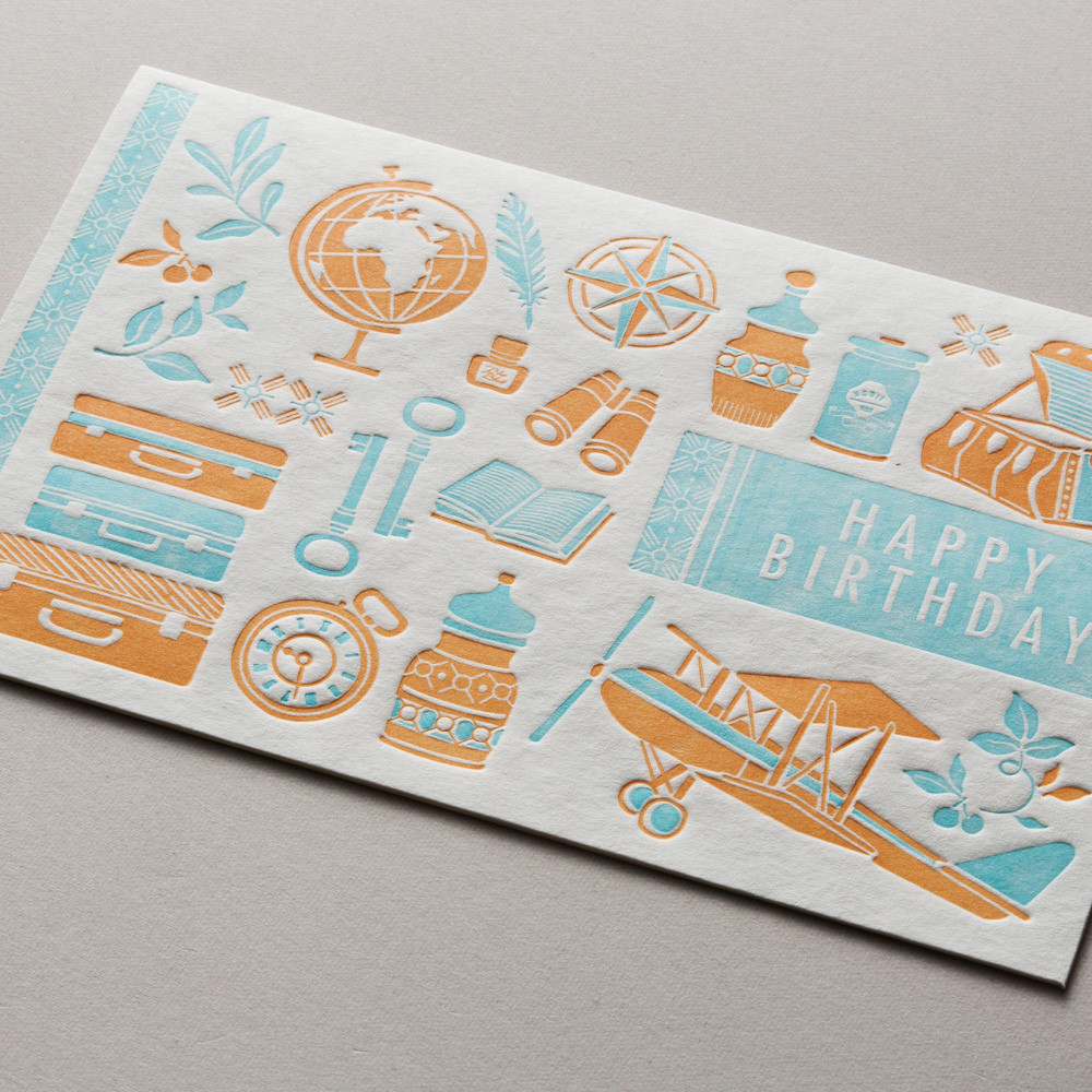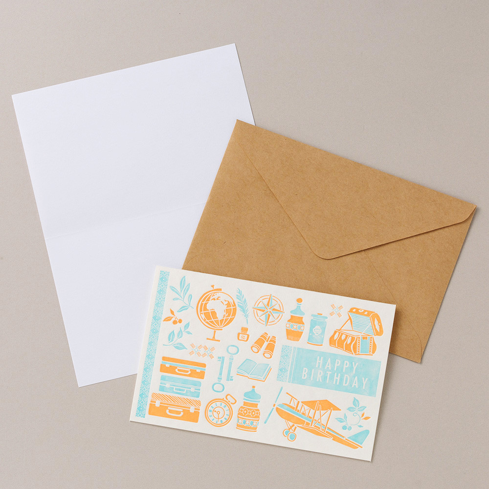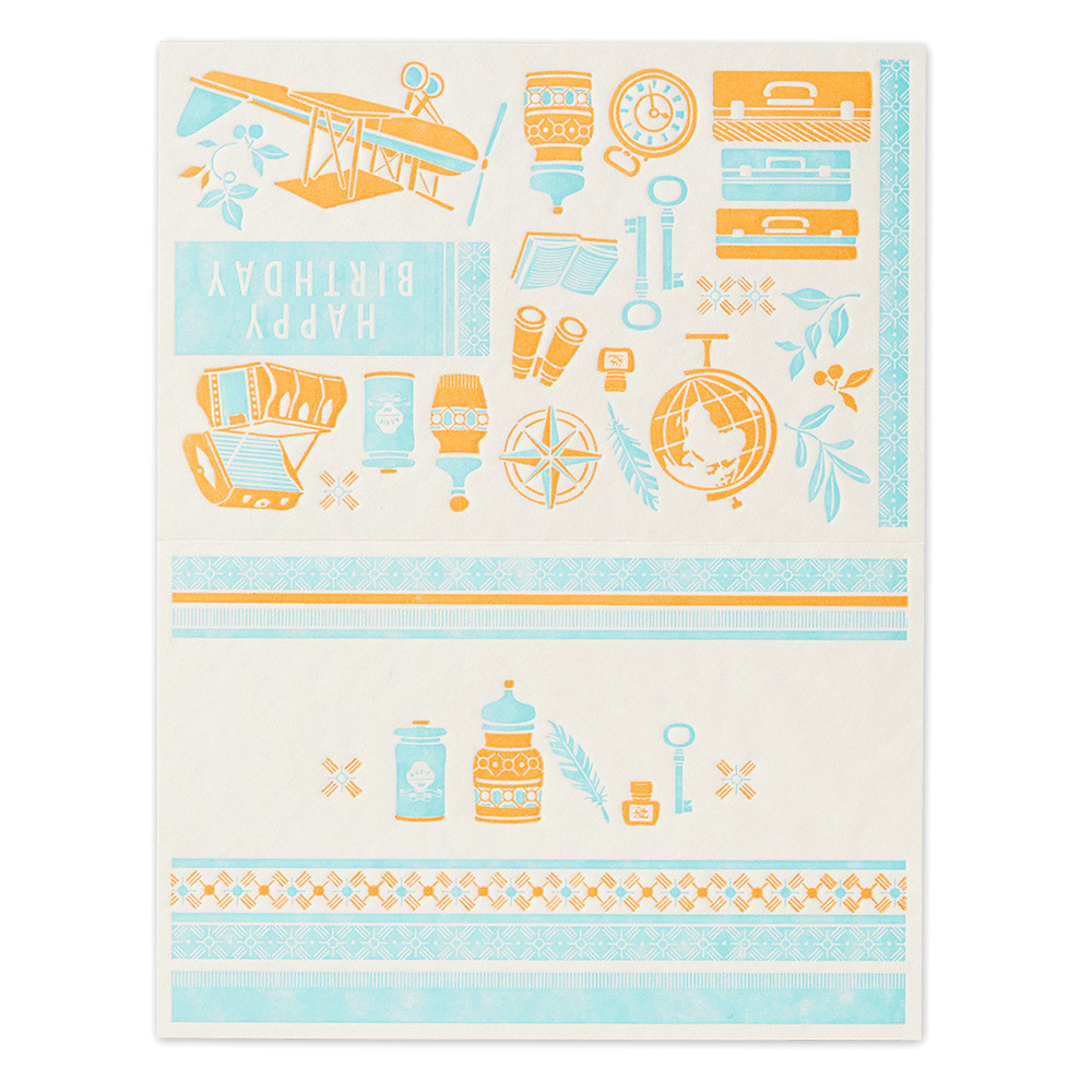 旅行関連の飛行機やトランクなどのモチーフをレトロに描いています。旅行好きな方に贈るのにおすすめです。