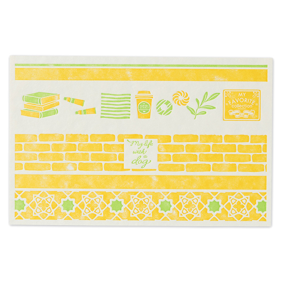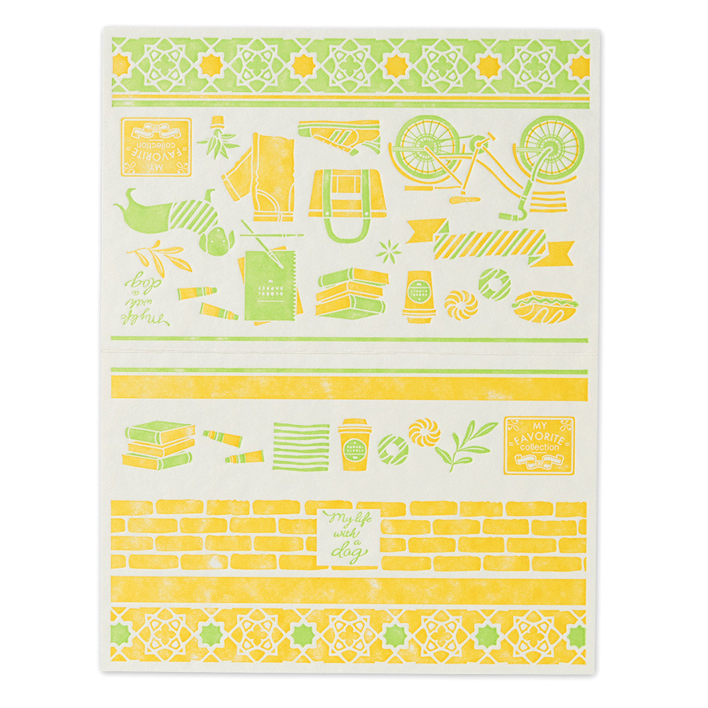 モチーフ:犬、ジーンズ、スニーカー、トートバック、自転車、ドーナツ、本、スケッチブック、絵具