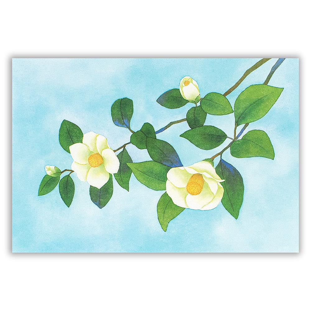 イラストレーター・小春 あやさんが描くポストカードです。白椿を優しく上品に描いています。季節の挨拶やお部屋のインテリアとして飾るのにもオススメです。