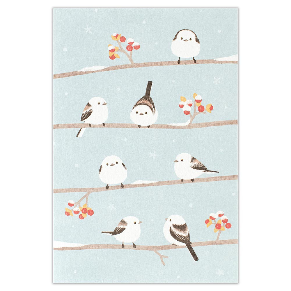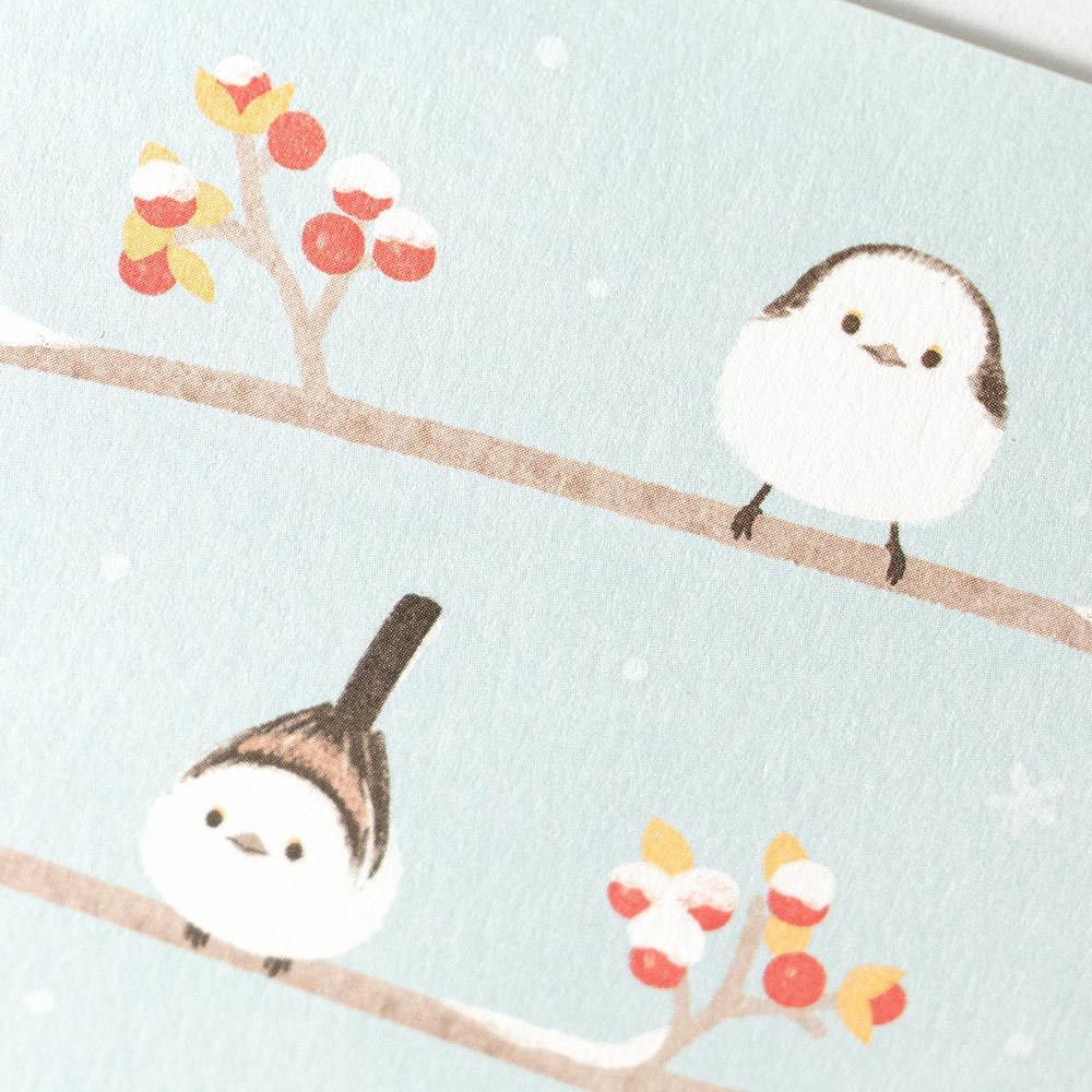 赤い実と木の枝にとまるシマエナガを描いたデザインです。