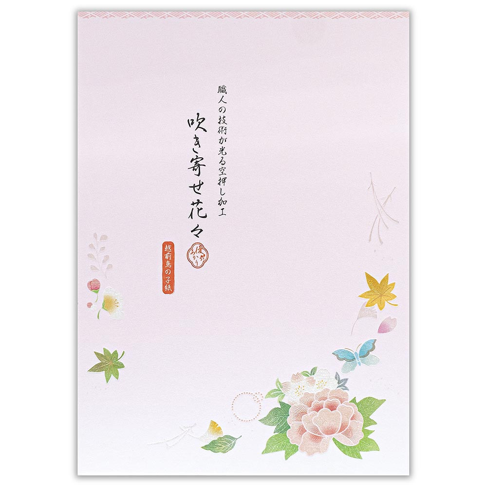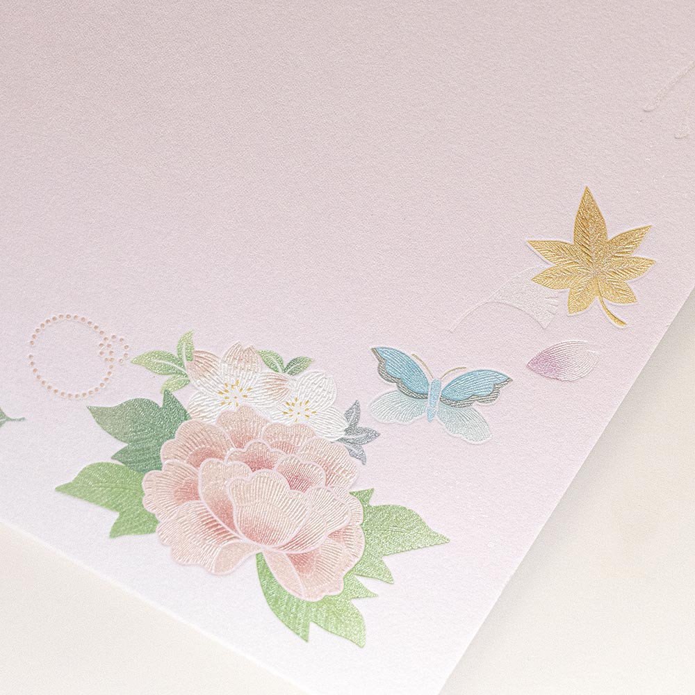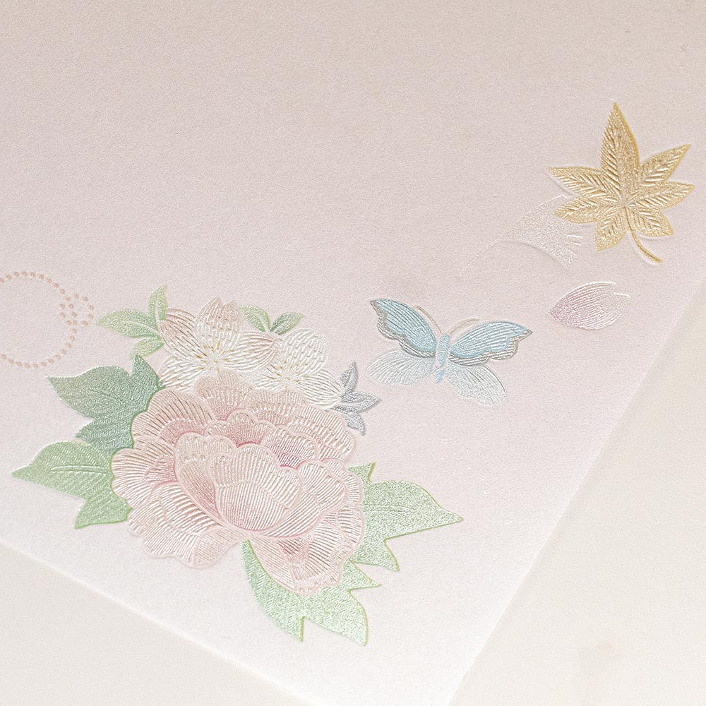 奥行き感のあるデボス加工の花のイラストが入った和紙便箋です。 さりげなく美しい花々が文章を引き立てます。 淡いピンク色の便箋です。
