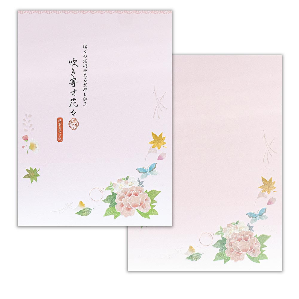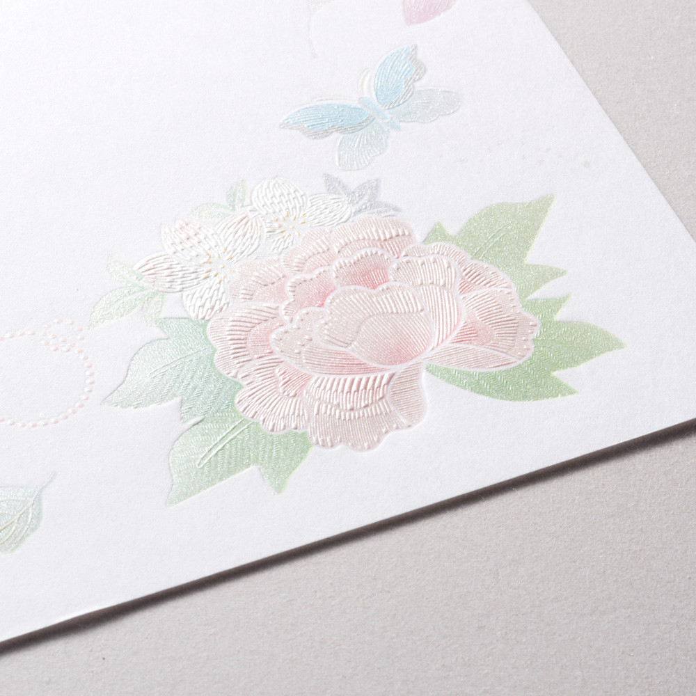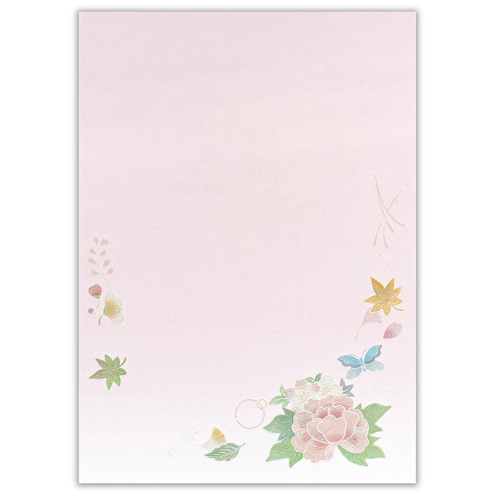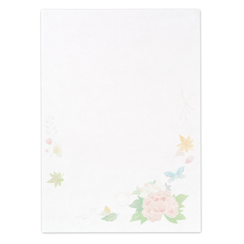 奥行き感のあるデボス加工の花のイラストが入った和紙便箋です。 さりげなく美しい花々が文章を引き立てます。 淡いピンク色の便箋です。