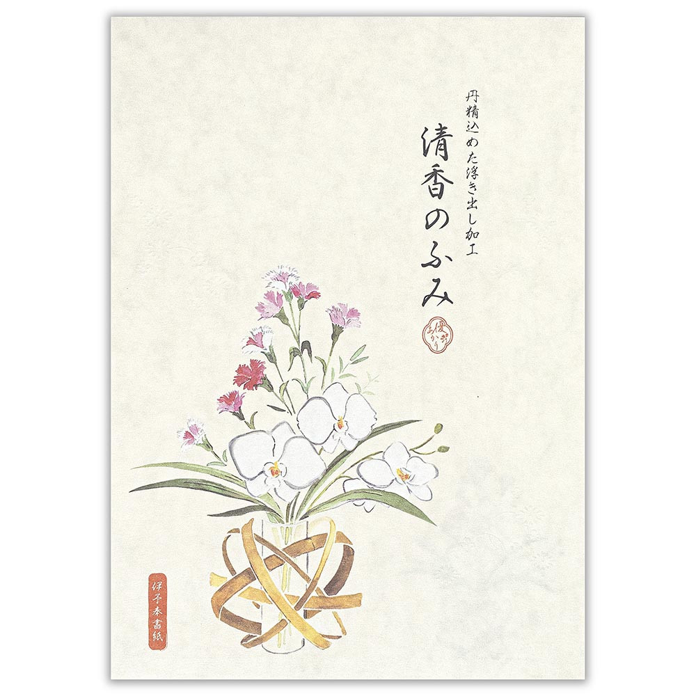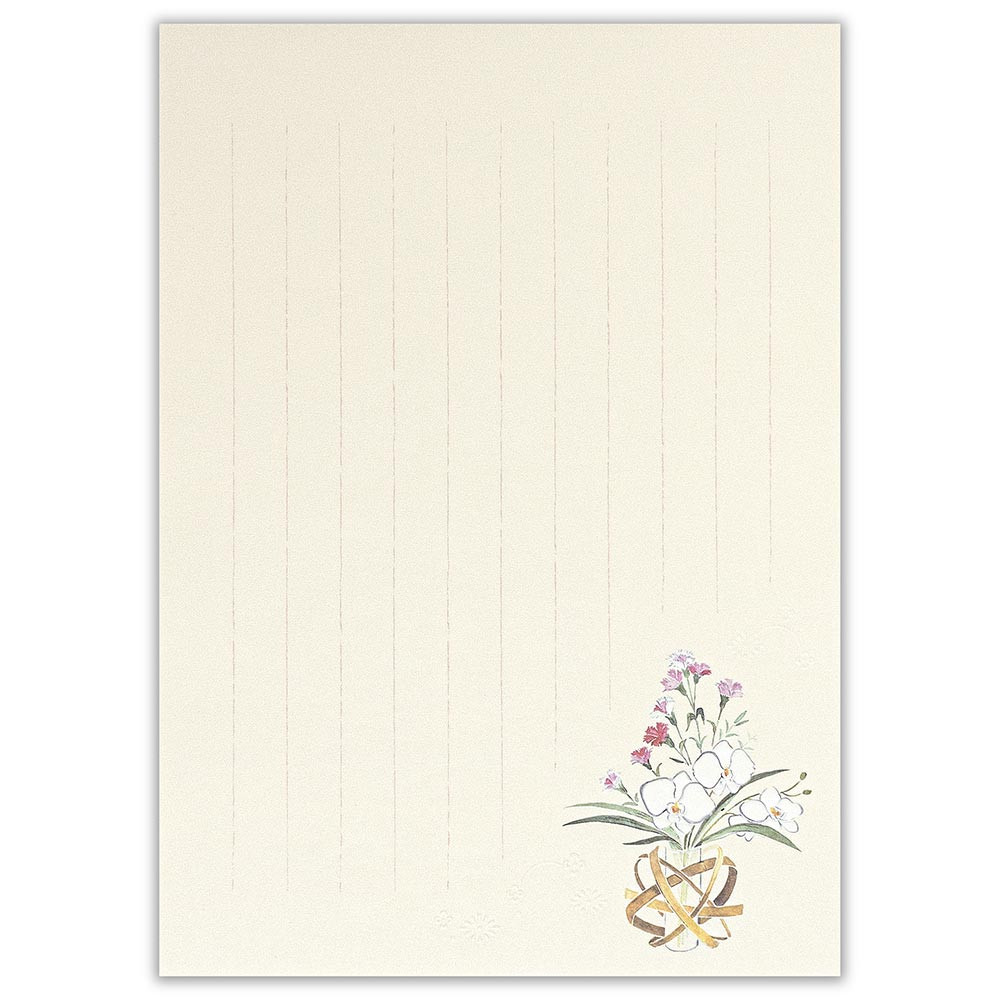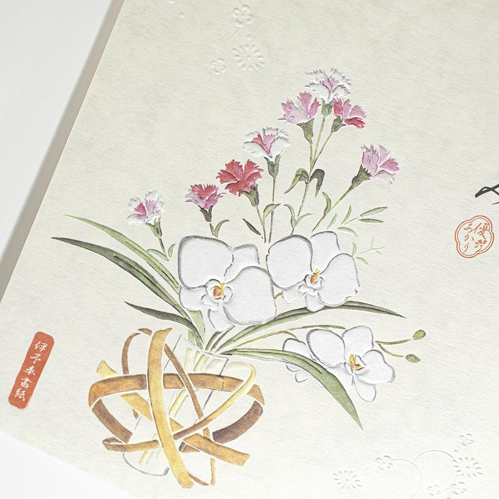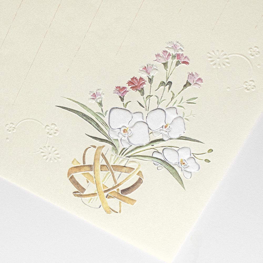 立体感のあるエンボス加工と描かれた花が美しい和紙便箋です。 花器に入った胡蝶蘭と差し色の撫子のコントラストが上品さを引き立てます。