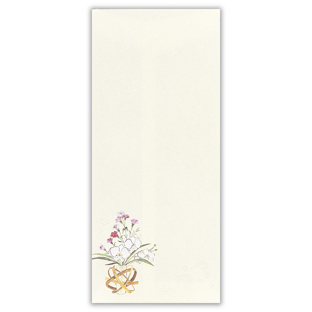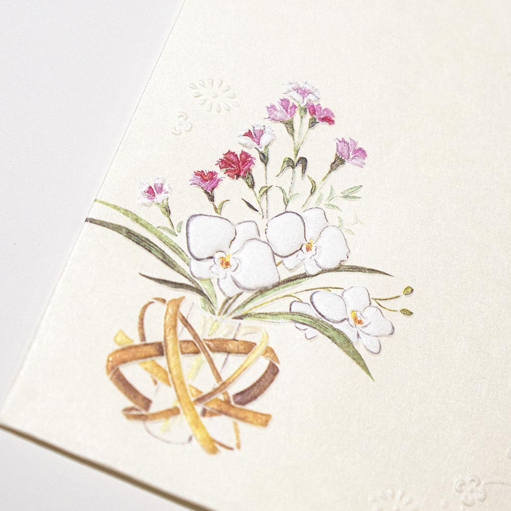 立体感のあるエンボス加工と描かれた花が美しい和紙封筒です。 花器に入った胡蝶蘭と差し色の撫子のコントラストが上品さを引き立てます。