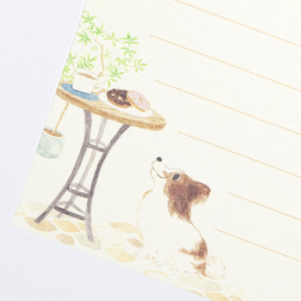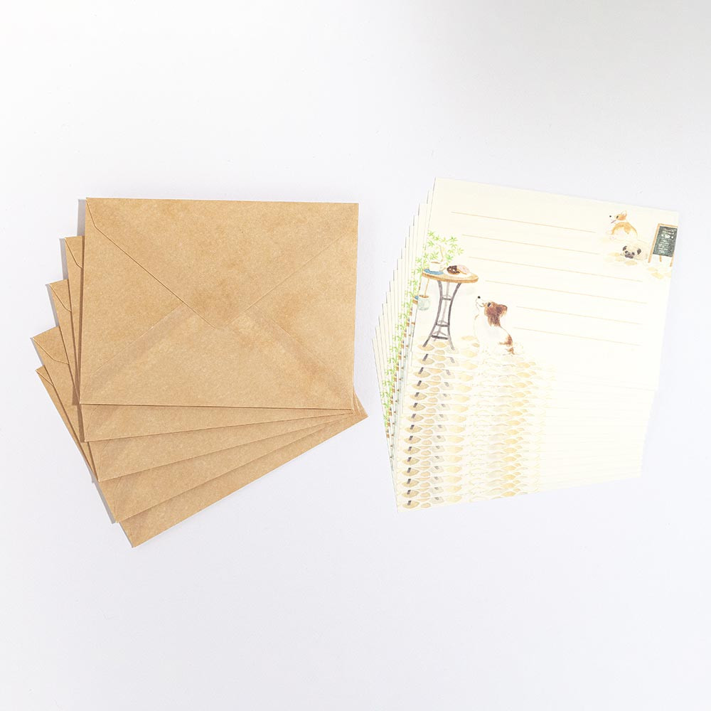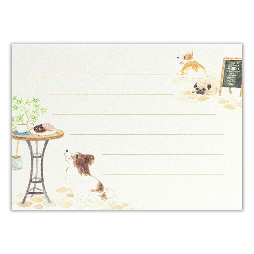 おしゃれなカフェと洋犬たちを描いた可愛いミニレターセットです。