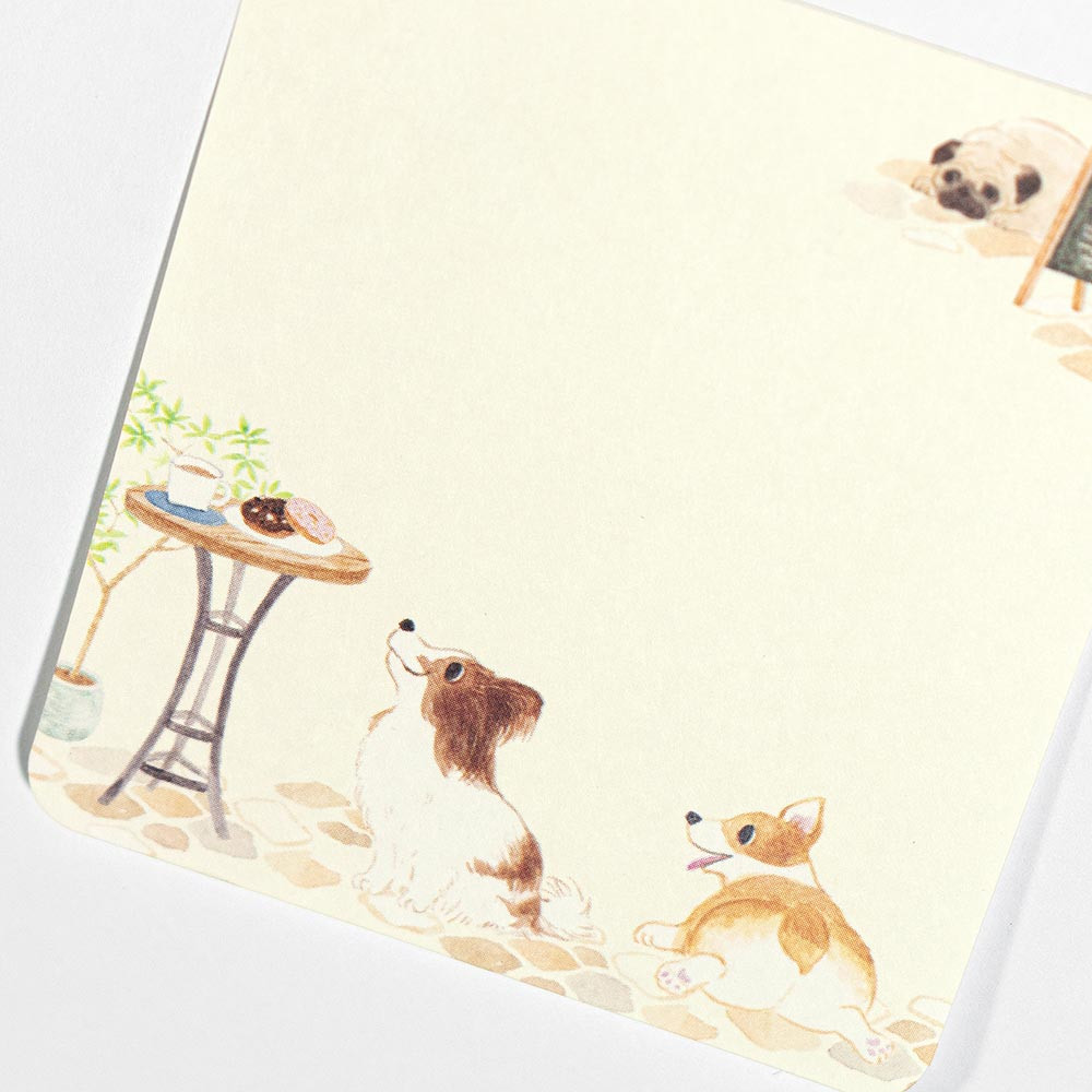 おしゃれなカフェと洋犬たちを描いた可愛いふせんです。