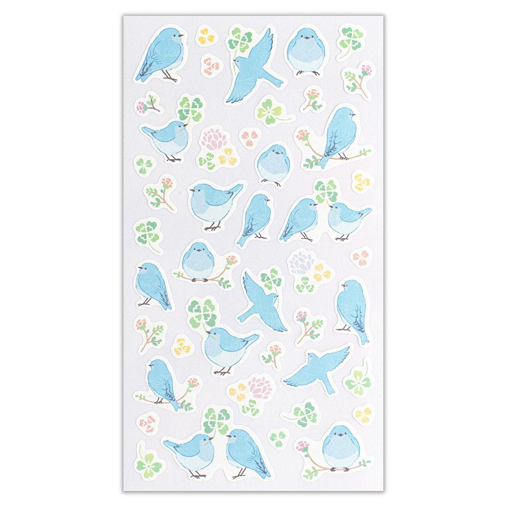 青い羽が美しいムジルリツグミとクローバーの組み合わせが可愛らしいデザインです。