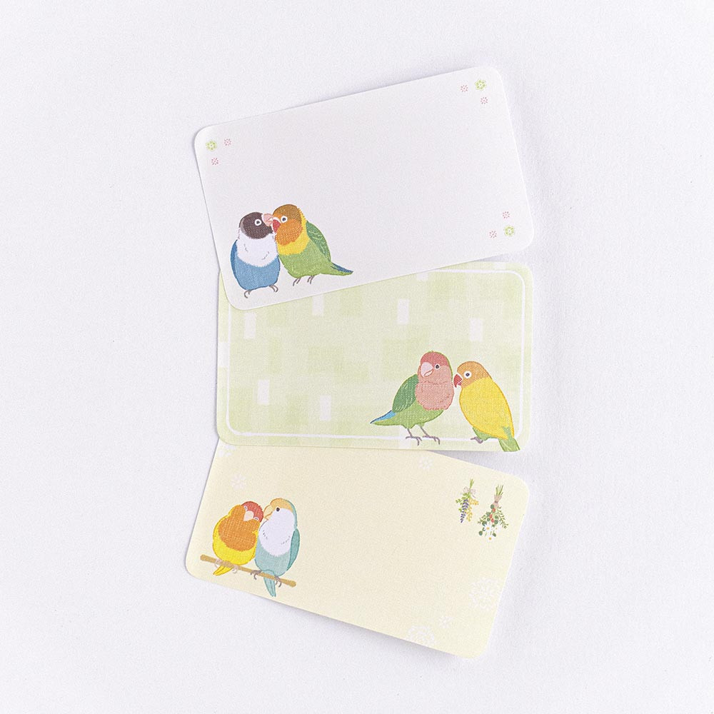 表情豊かなコザクラインコやボタンインコに、思わず笑顔がこぼれるデザインです。