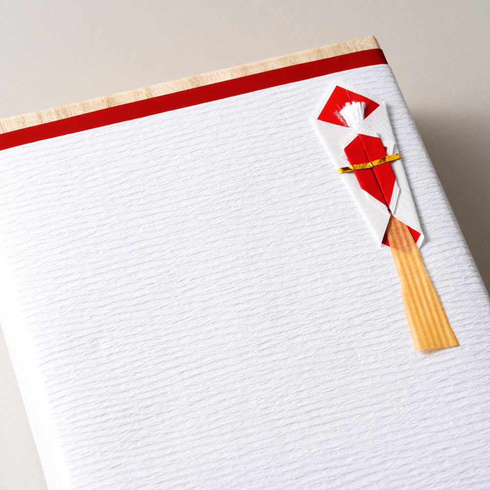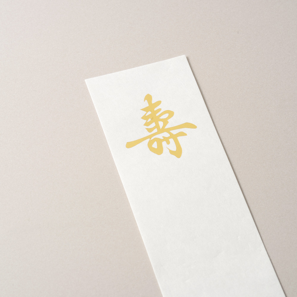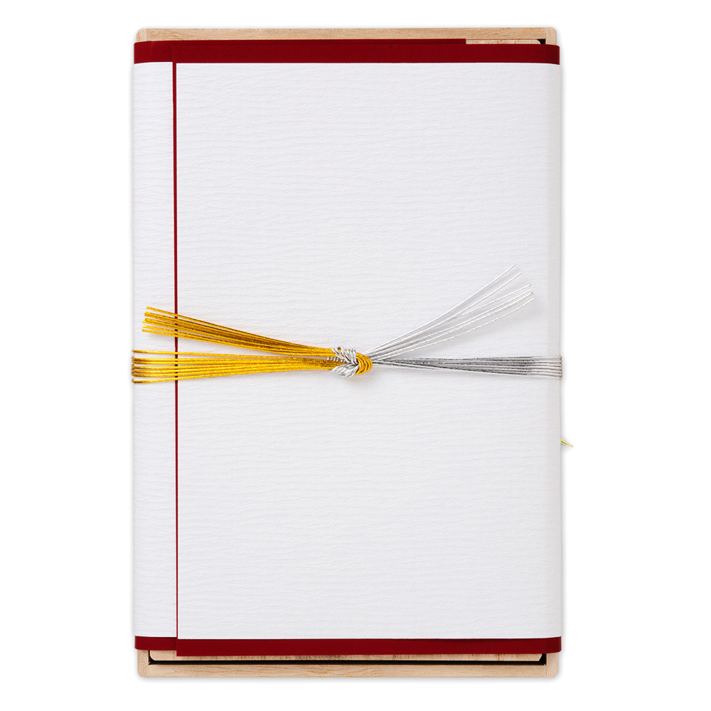 水引を下側に降ろし、掛け紙を取り外して桐箱の中にお金を入れてお使いいただけます。掛け紙の向きについては説明書内に記載されています。