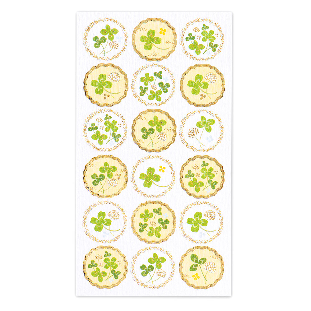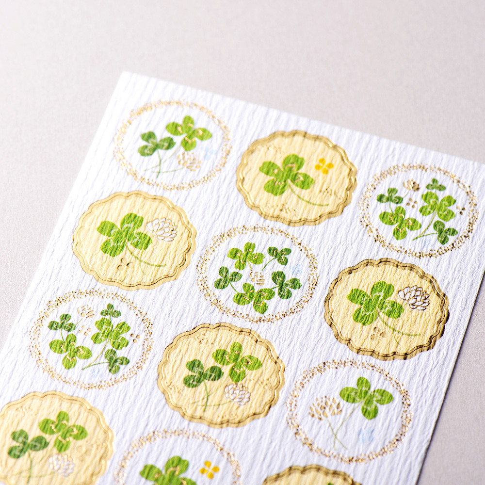 風合いのある紙に金箔が輝く、和風シールです。幸福のモチーフとされるクローバーをたっぷりと描きました。