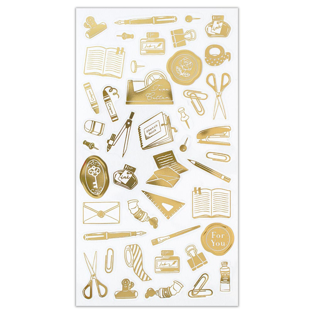 金箔が輝く透明シールです。 日常でよく使う文具を、全面金箔押し加工でおしゃれにデザインしました。お手紙や手帳のデコレーションにおすすめです。