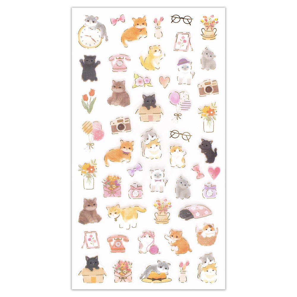 暮らしのモチーフとまったりする動物がかわいい、金箔が輝く透明シール。