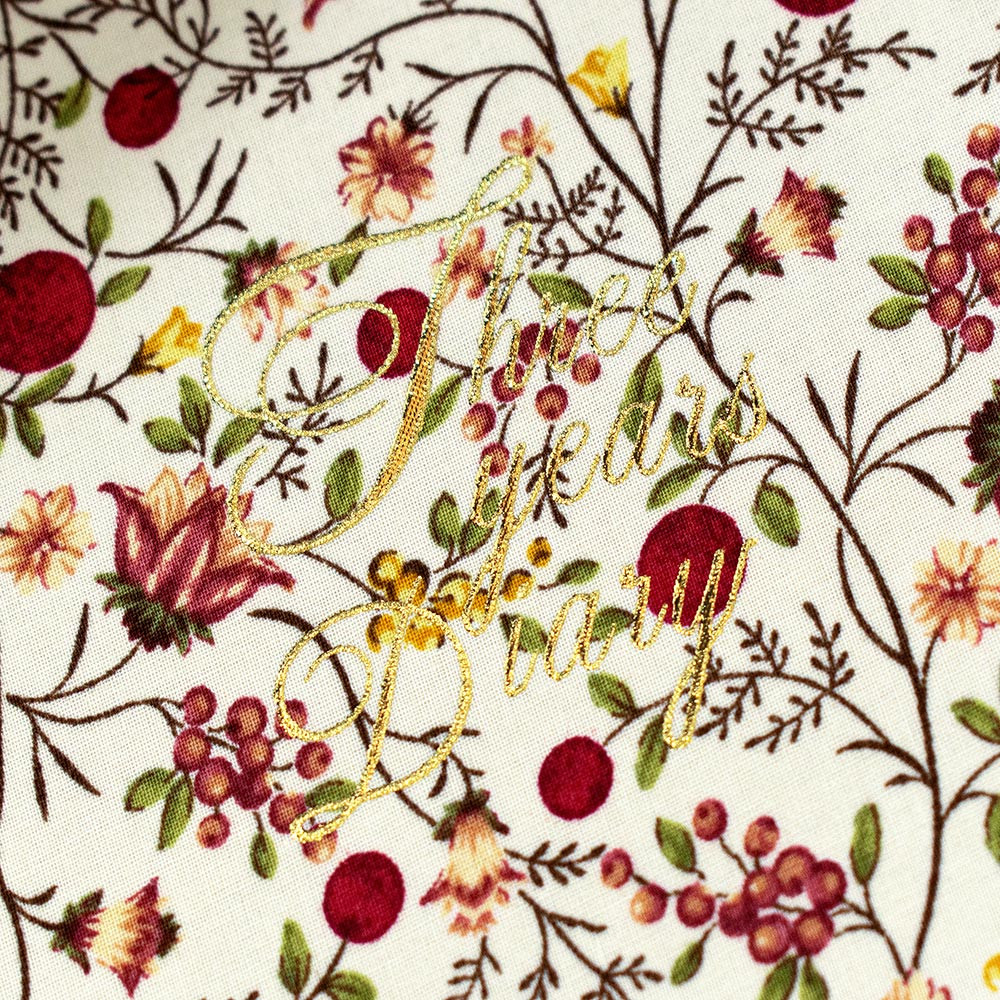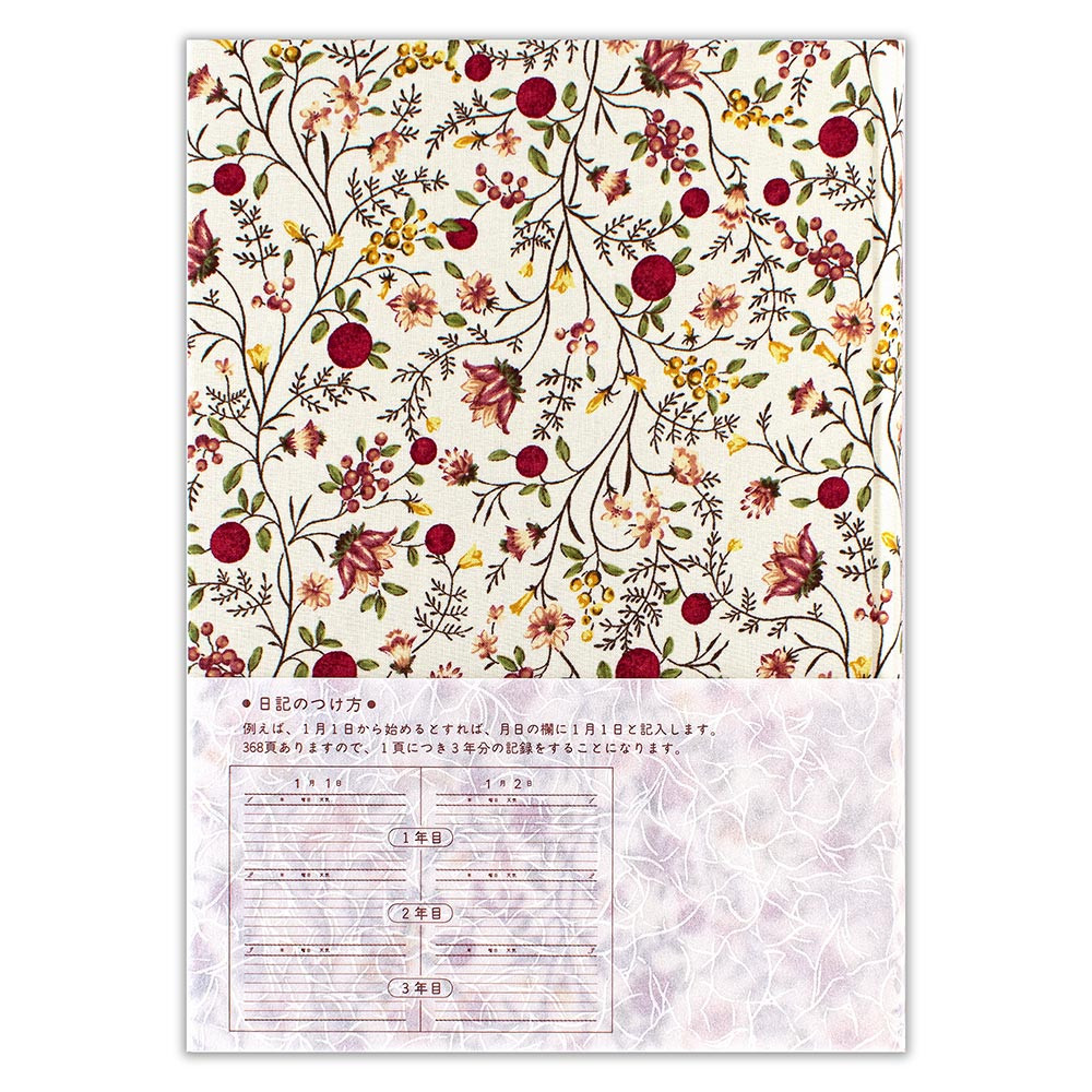 表紙の花柄が華やかな三年日記です。 本文にも花模様が入っています。 一ページに三年分を記入でき、思い出を比べられるようになっています。