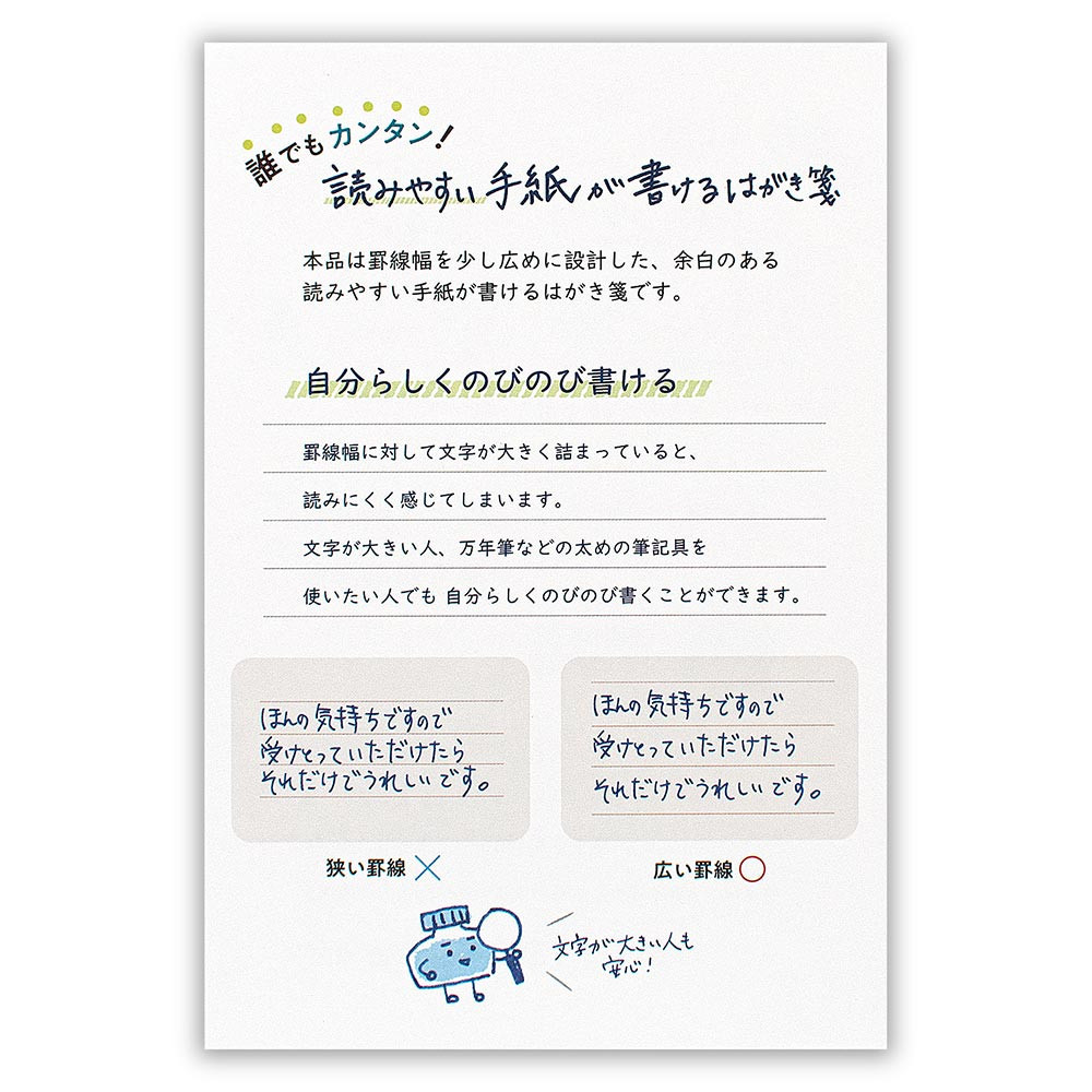 すっきりと読みやすい手紙が書けるよう、罫線幅を少し広めに設計したはがき箋です。