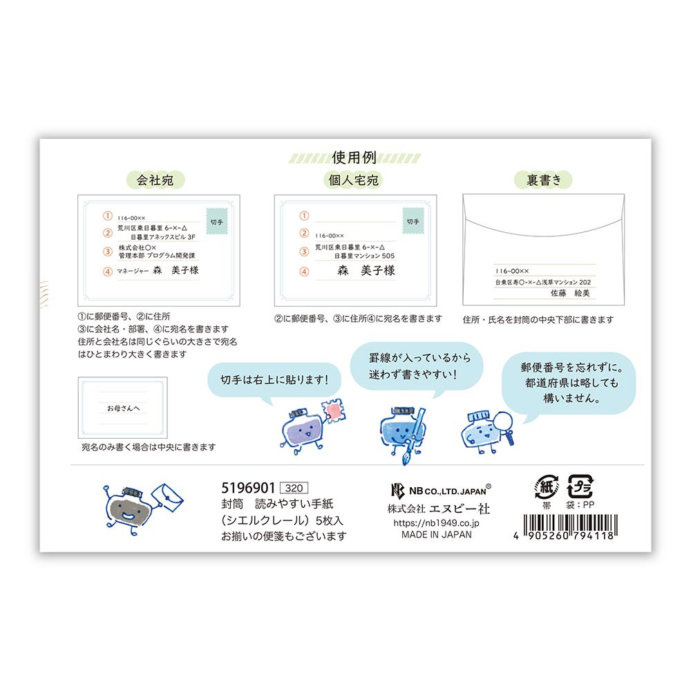 会社宛、個人宅宛、宛名のみ、裏書きの使用例の説明書付。