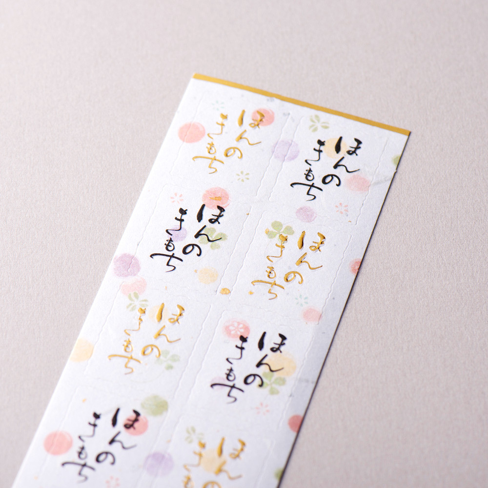 水玉と四葉のクローバーのイラストに、エンボス加工と金箔押し加工の「ほんのきもち」のメッセージが入ったシールです。