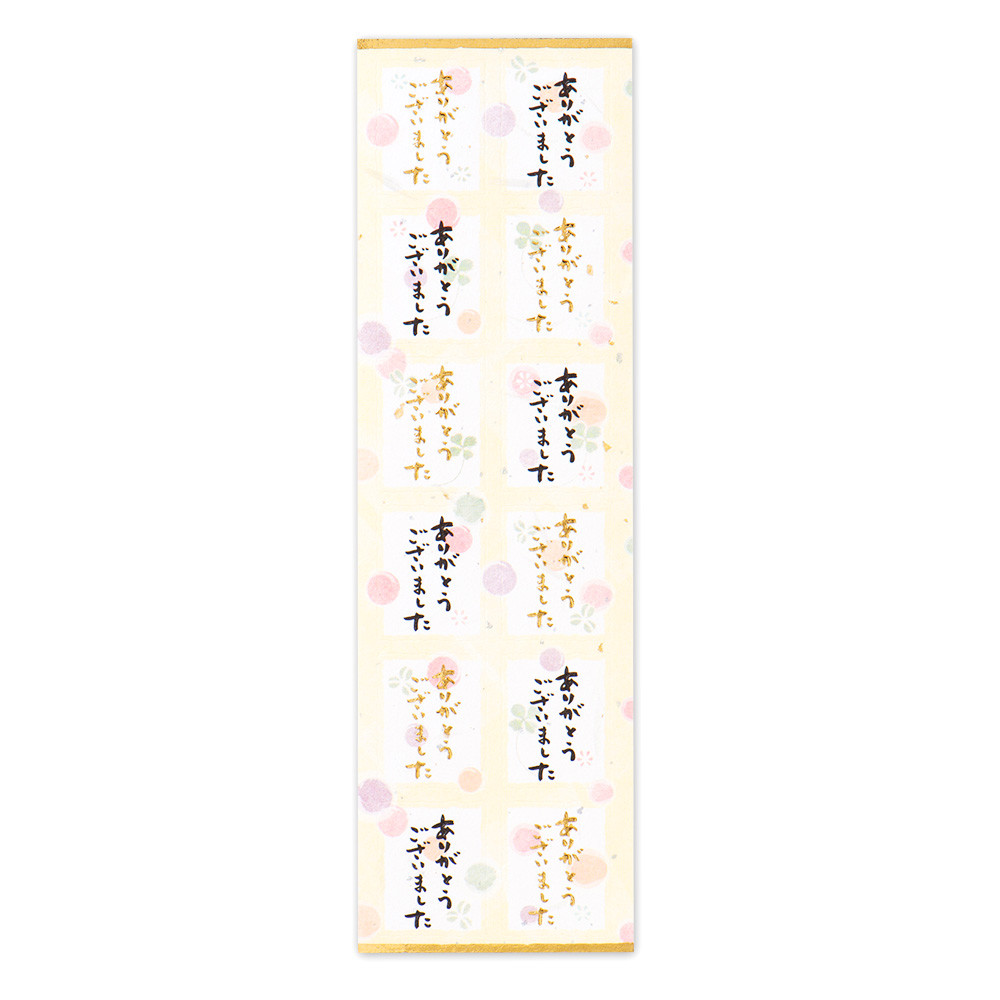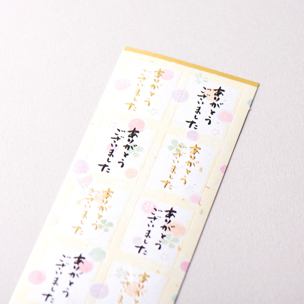 水玉とクローバーのイラストに、エンボス加工と金箔押し加工の「ありがとうございました」のメッセージが入ったシールです。