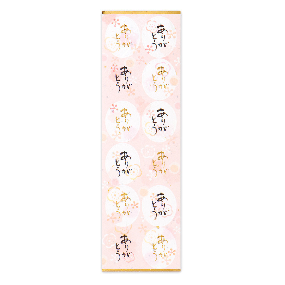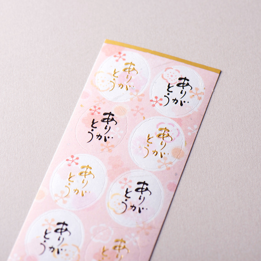 可愛らしい梅の花のイラストに、エンボス加工と金箔押し加工の「ありがとう」のメッセージが入ったシールです。