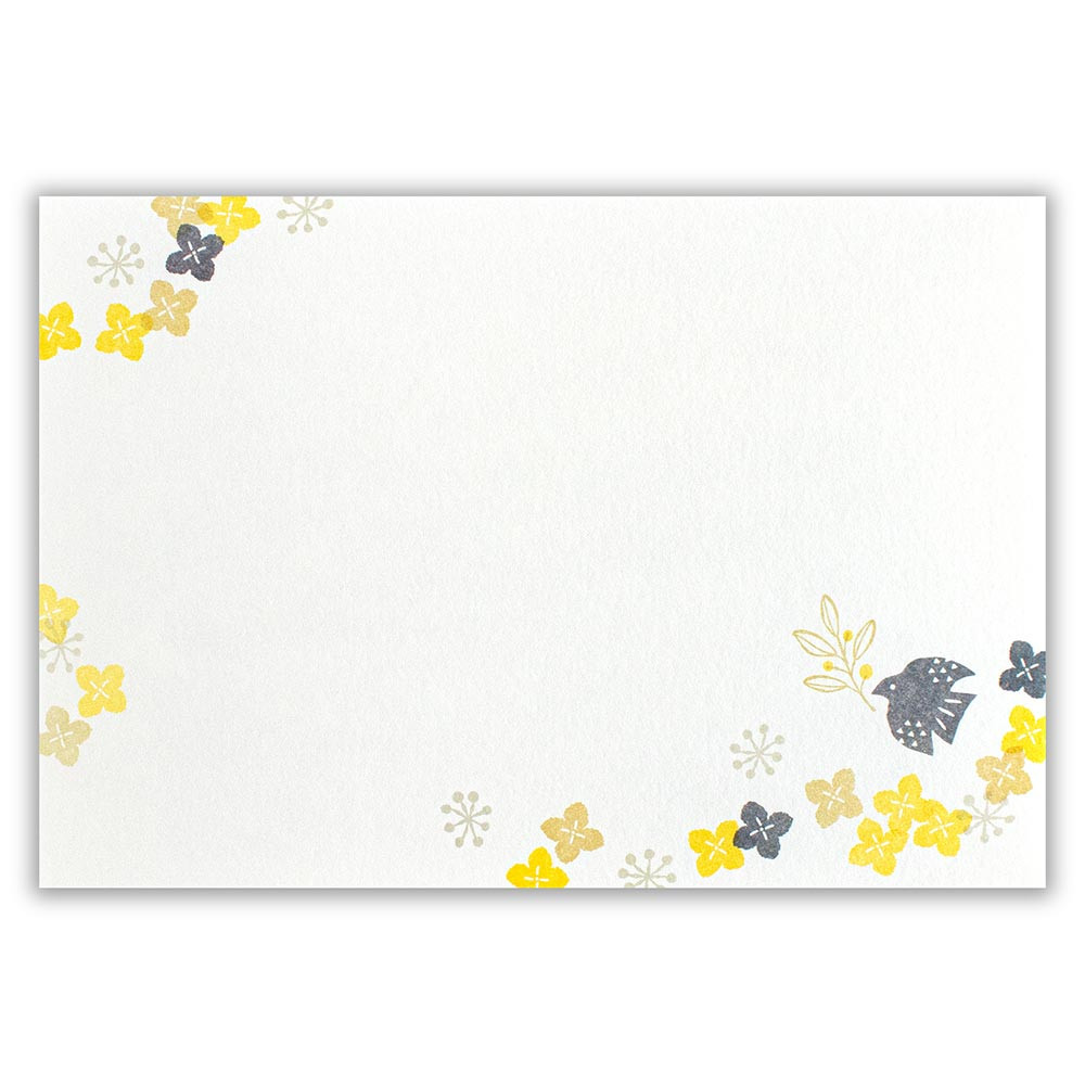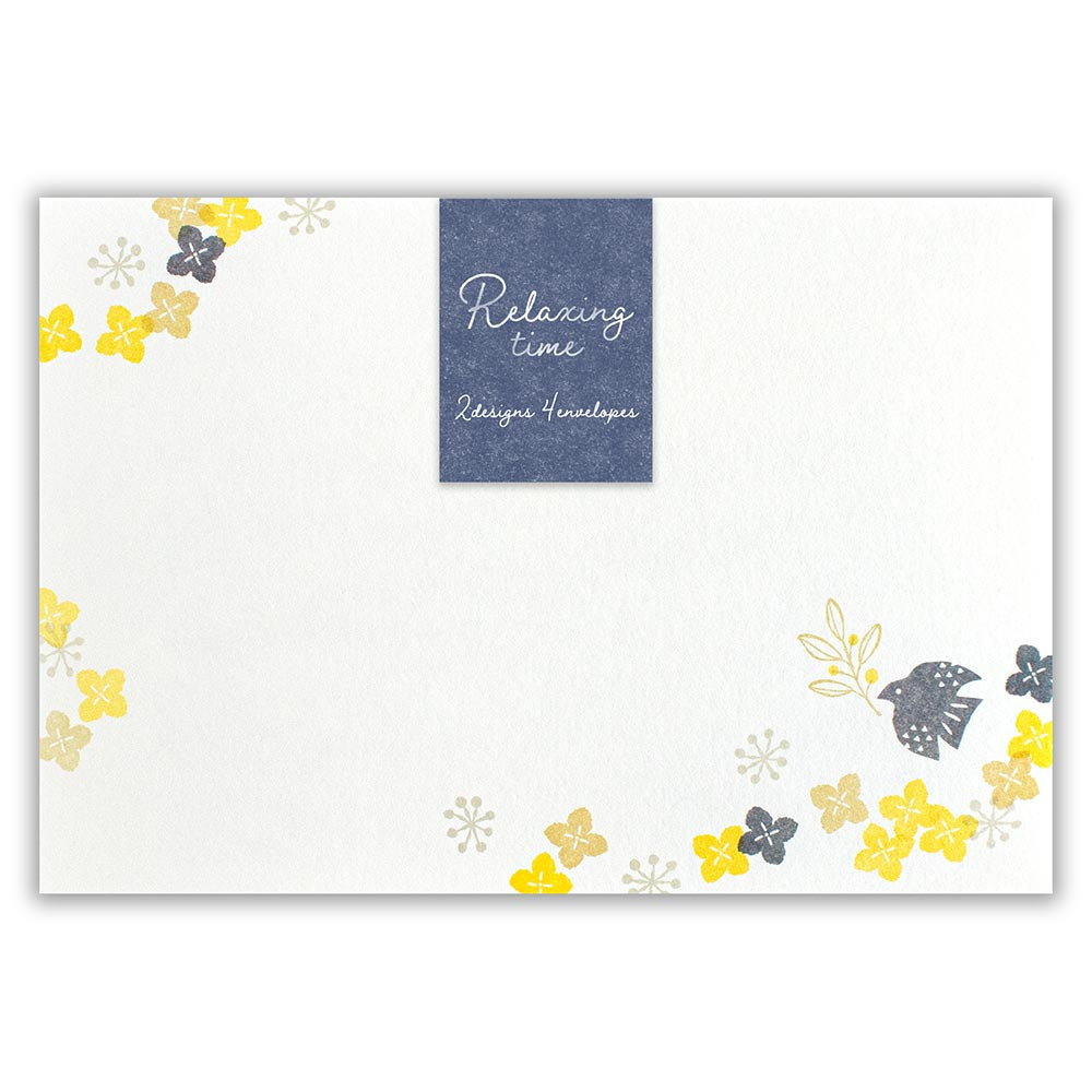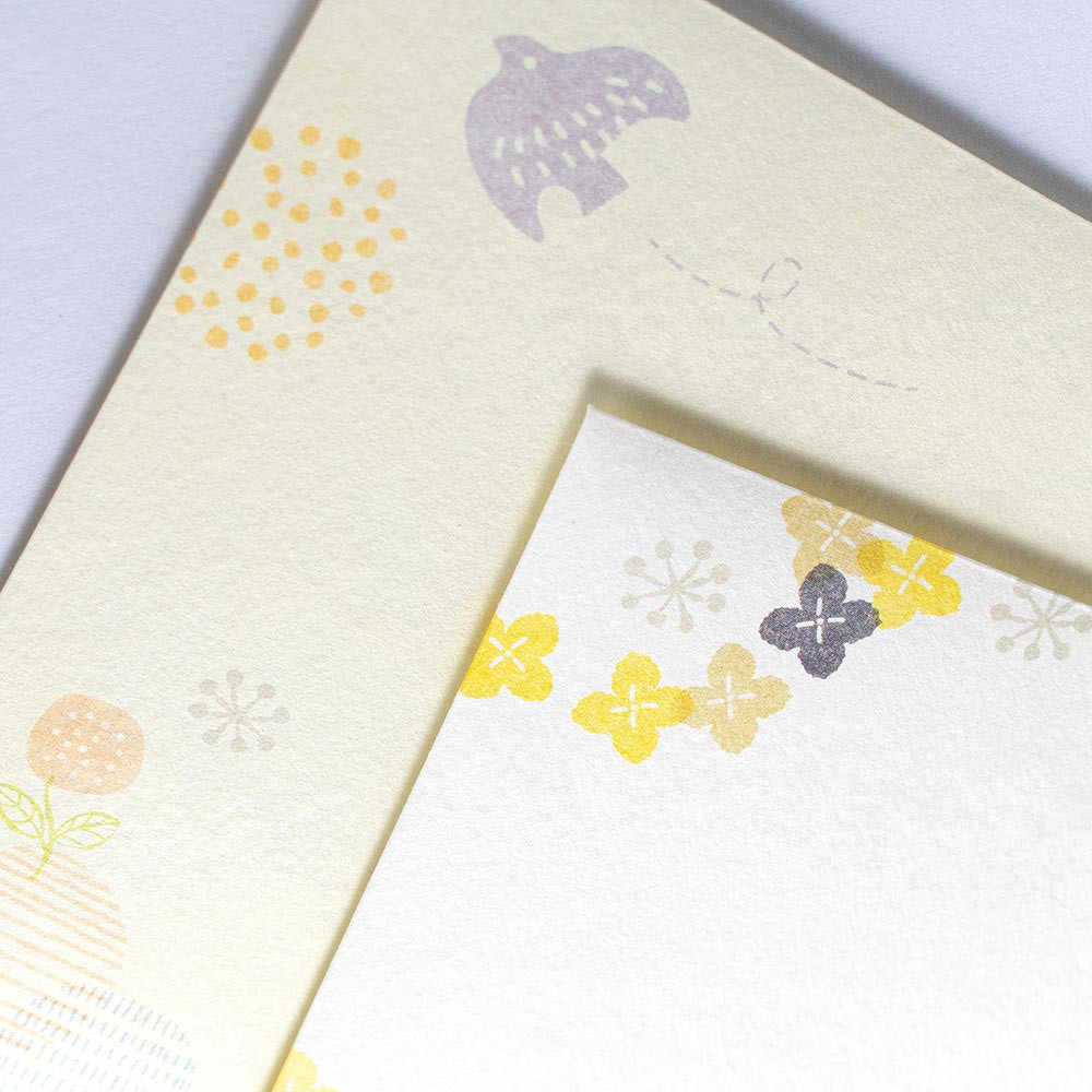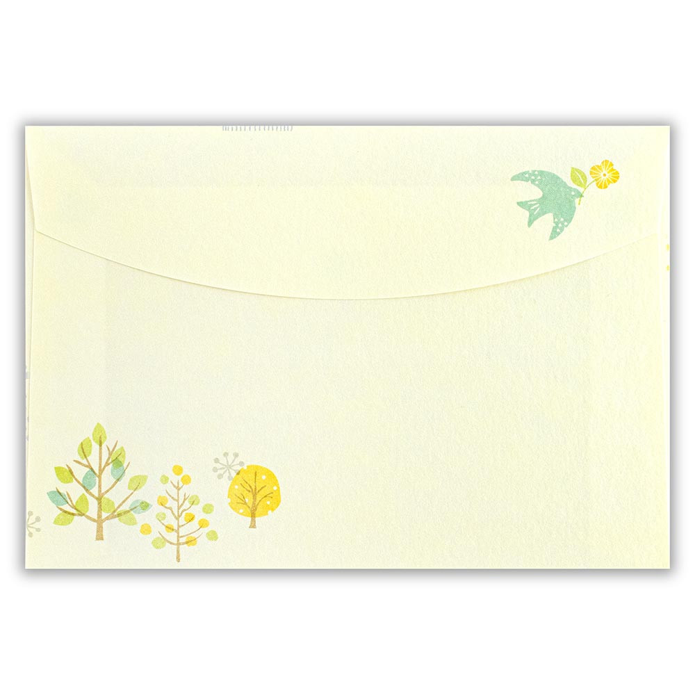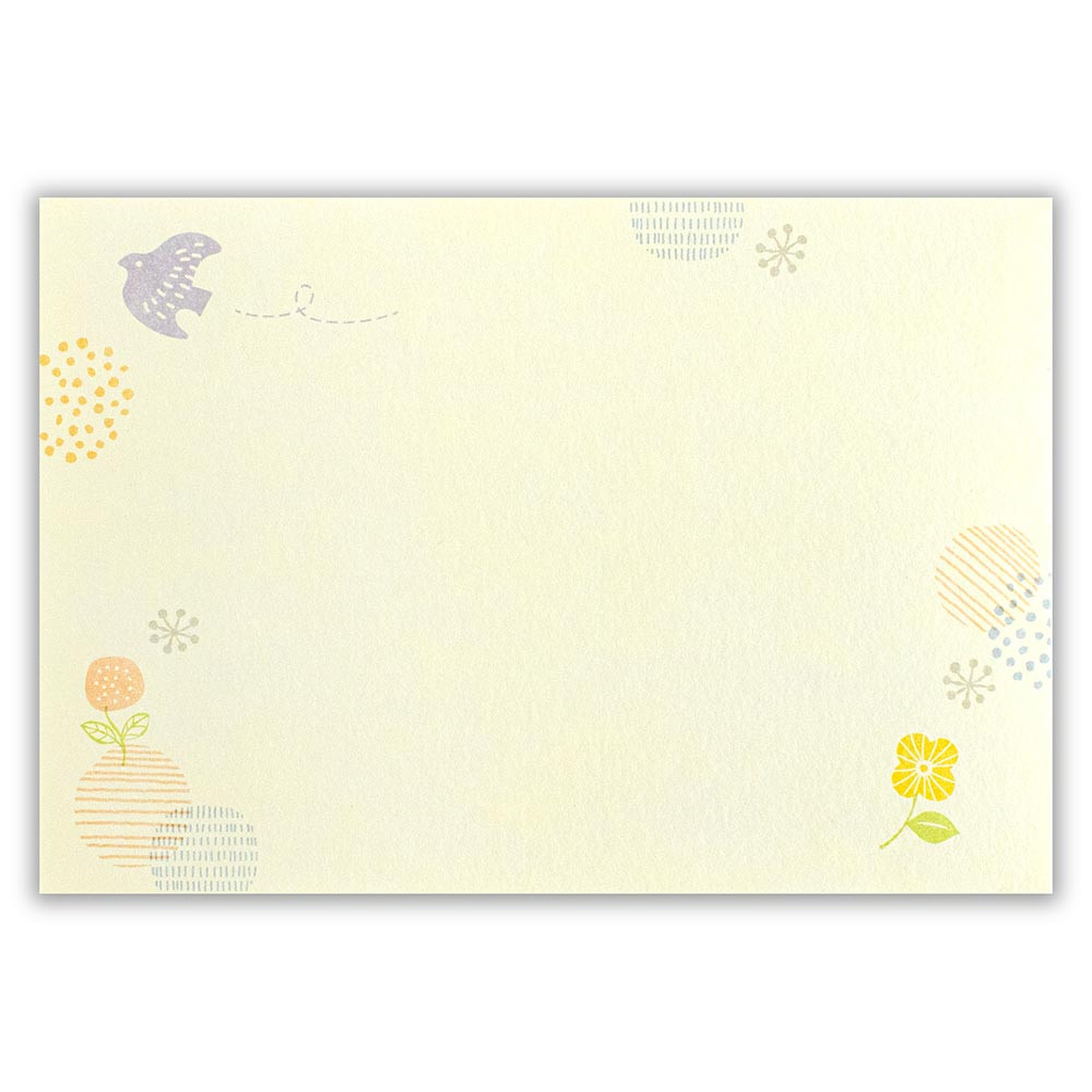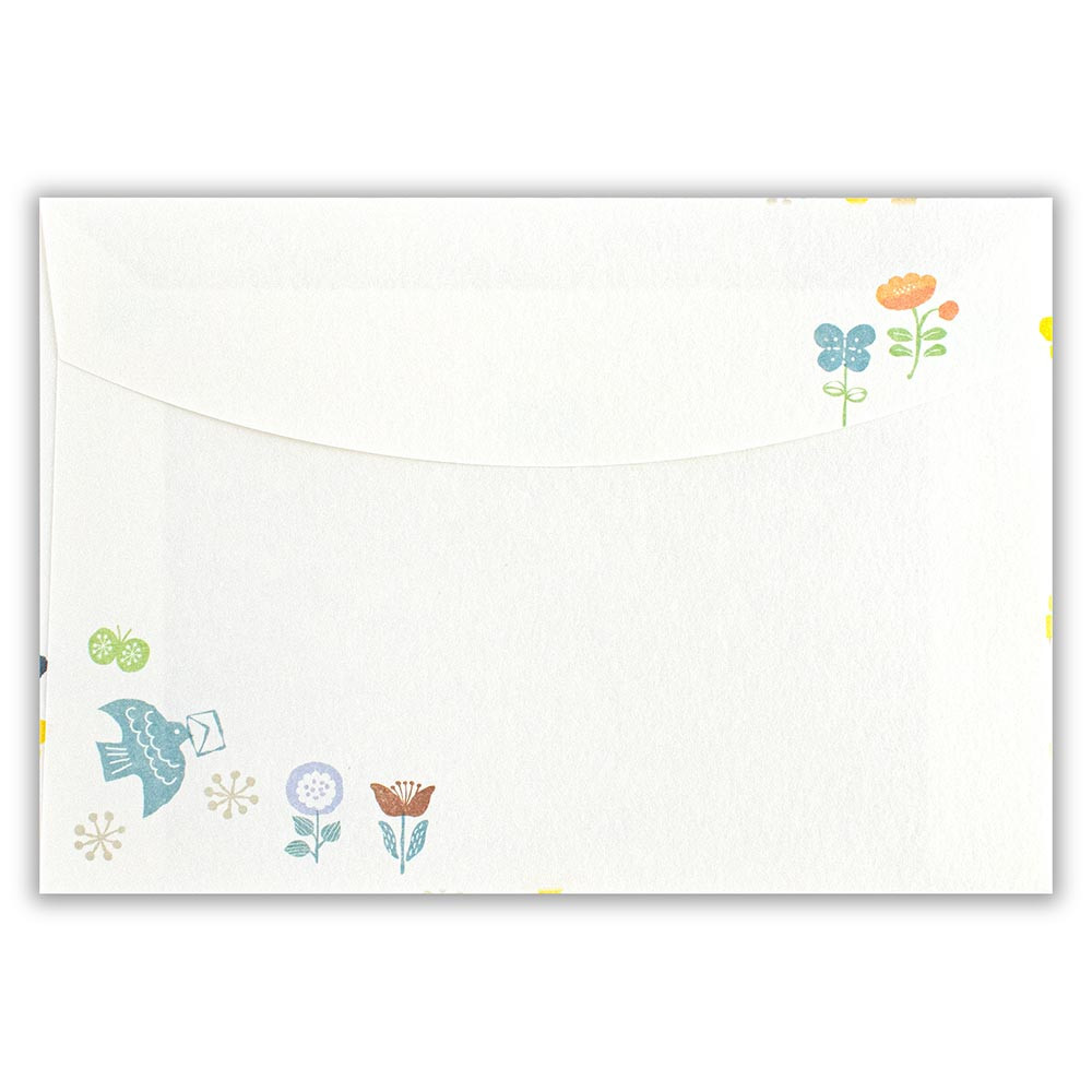 鳥、花、木々などをほっこり可愛く描き、2柄アソートの封筒に散りばめました。